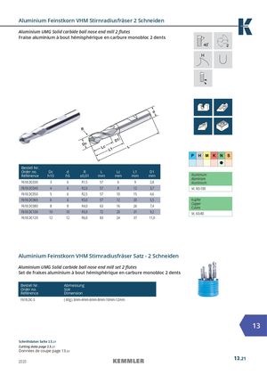 Aluminium Feinstkorn VHM Stirnradiusfräser 2 Schneiden Aluminium UMG Solid carbide ball nose end mill 2 flutes Fraise aluminium à bout hémisphérique en carbure monobloc 2 dents Bestell Nr. Order no. Dc d R L Lc L1 D1 Référence h10 h5 ±0,01 mm mm mm mm Aluminium Aluminium F618.DC030 3 6 R1,5 57 6 9 2,8 Aluminium F618.DC040 4 6 R2,0 57 8 12 3,7 Vc. 80-100 F618.DC050 5 6 R2,5 57 10 15 4,6 F618.DC060 6 6 R3,0 57 12 20 5,5 Kupfer F618.DC080 8 8 R4,0 63 16 26 7,4 CopperCuivre F618.DC100 10 10 R5,0 72 20 31 9,2 Vc. 60-80 F618.DC120 12 12 R6,0 83 24 37 11,0 Aluminium Feinstkorn VHM Stirnradiusfräser Satz - 2 Schneiden Aluminium UMG Solid carbide ball nose end mill set 2 flutes Set de fraises aluminium à bout hémisphérique en carbure monobloc 2 dents Bestell Nr. Abmessung Order no. Size Référence Dimension F618.DC-S ( 6tlg.) 3mm-4mm-6mm-8mm-10mm-12mm 13 Schnittdaten Seite 13.27 Cutting data page 13.27 Données de coupe page 13.27 13.21 2020