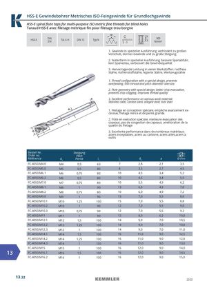 HSS-E Gewindebohrer Metrisches ISO-Feingewinde für Grundlochgewinde HSS-E spiral flute taps for multi-purpose ISO metric fine threads for blind holes Taraud HSS-E avec filetage métrique fin pour filetage trou borgne HSS-E DIN374 Tol. 6 H DIN 13 Typ N 900N/mm² 1. Gewinde in spezieller Ausführung, verhindert zu großen Vorschub, dünnes Gewinde und zu große Steigung. 2. Nutenform in spezieller Ausführung, bessere Spanabfuhr, kein Spänestau, verbessert die Gewindequalität 3. Hervorragende Leistung in vielen Werkstoffen: rostfreie Stähle, Kohlenstoffstähle, legierte Stähle, Werkzeugstähle 1. Thread configuration with a special design, prevents overfeeding, thin thread and pitch diameter oversize. 2. Flute geometry with special design, better chip evacuation, prevents chip clogging, improves thread quality 3. Excellent performance on various work material: Stainless steel, carbon steel, alloyed steel, tool steel 1. Filetage en conception spéciale, empêche avancement ex- cessive, filetage mince et de pente grande. 2. Flûte en exécution spéciale, meilleure évacuation des copeaux, pas de congestion de copeaux, amélioration de la qualité du filetage 3. Excellente performance dans de nombreux matériaux: aciers inoxydables, aciers au carbone, aciers alliés,aciers à outils Bestell Nr. Steigung Order no. Pitch Référence d1 Pente l1 l2 d2 a FC.4050.M4.0 M4 0,5 63 7 2,8 2,1 3,5 FC.4050.M5.0 M5 0,5 80 8 3,5 2,7 4,5 FC.4050.M6.1 M6 0,75 80 10 4,5 3,4 5,2 FC.4050.M6.2 M6 0,5 80 10 4,5 3,4 5,5 FC.4050.M7.0 M7 0,75 80 10 5,5 4,3 6,2 FC.4050.M8.1 M8 1 90 13 6,0 4,9 7,0 FC.4050.M8.2 M8 0,75 80 10 6,0 4,9 7,2 FC.4050.M9.0 M9 1 90 13 7,0 5,5 8,0 FC.4050.M10.1 M10 1,25 100 15 7,0 5,5 8,8 FC.4050.M10.2 M10 1 90 12 7,0 5,5 9,0 FC.4050.M10.3 M10 0,75 90 12 7,0 5,5 9,2 FC.4050.M11 M11 1 90 12 8,0 6,2 10,0 FC.4050.M12.1 M12 1,5 100 14 9,0 7,0 10,5 FC.4050.M12.2 M12 1,25 100 14 9,0 7,0 10,8 FC.4050.M12.3 M12 1 100 14 9,0 7,0 11,0 FC.4050.M14.1 M14 1,5 100 16 11,0 9,0 12,5 FC.4050.M14.2 M14 1,25 100 16 11,0 9,0 12,8 FC.4050.M14.3 M14 1 100 16 11,0 9,0 13,0 FC.4050.M15 M15 1 100 16 12,0 9,0 14,0 13 FC.4050.M16.1 M16 1,5 100 16 12,0 9,0 14,5 FC.4050.M16.2 M16 1 100 16 12,0 9,0 15,0 13.32 2020