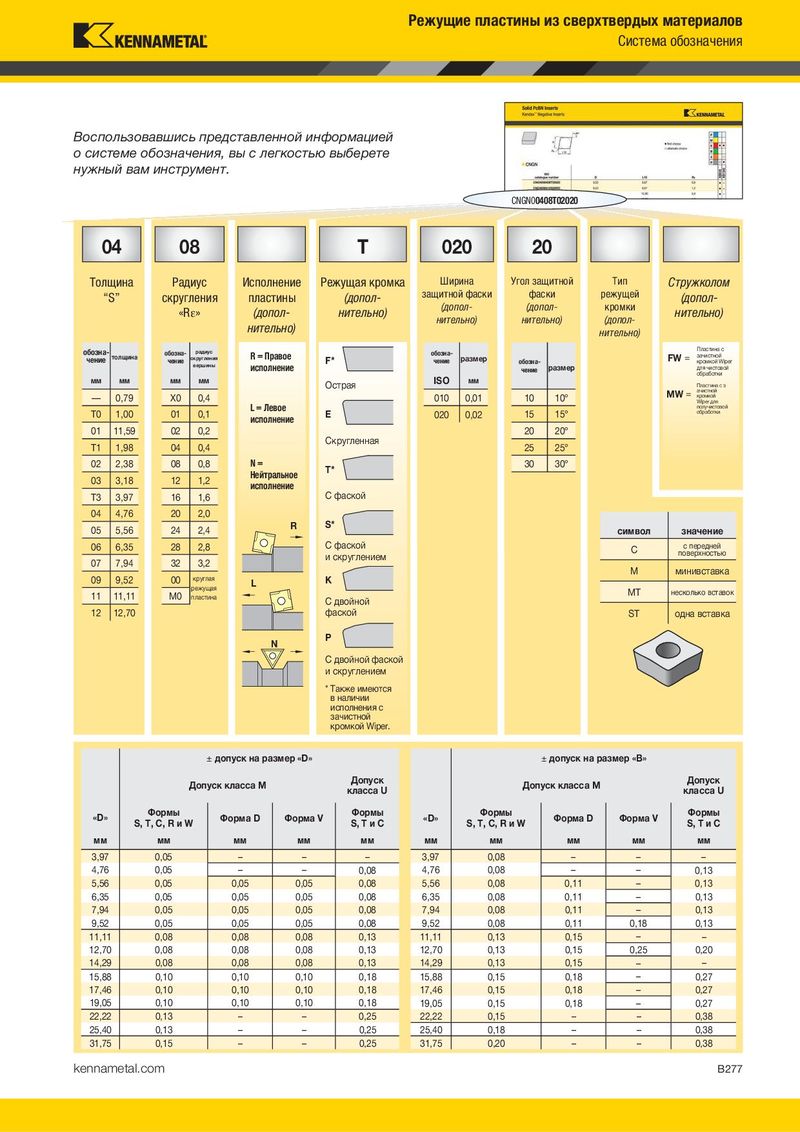 Режущие пластины из сверхтвердых материалов Система обозначения Воспользовавшись представленной информацией о системе обозначения, вы с легкостью выберете нужный вам инструмент. CNGN00408T02020 04 08 T 020 20 Толщина Радиус Исполнение Режущая кромка Ширина Угол защитной Тип Стружколом “S” скругления пластины (допол- защитной фаски фаски режущей (допол- «R¡» (допол- нительно) (допол- (допол- кромки нительно) нительно) нительно) нительно) (допол- нительно) обозна- обозна- радиус обозна- Пластина с чение толщина скругления R = Правое F* размер FW = зачистной чение вершины исполнение чение обозна- размер кромкой Wiper чение для чистовой обработки мм мм мм мм Острая ISO мм Пластина с з MW = ачистной — 0,79 X0 0,4 010 0,01 10 10° кромкой L = Левое Wiper для получистовой T0 1,00 01 0,1 E 020 0,02 15 15° обработки исполнение 01 11,59 02 0,2 20 20° T1 1,98 04 0,4 Скругленная 25 25° 02 2,38 08 0,8 N= T* 30 30° 03 3,18 12 1,2 Нейтральное исполнение T3 3,97 16 1,6 С фаской 04 4,76 20 2,0 05 5,56 24 2,4 R S* символ значение 06 6,35 28 2,8 С фаской C с передней поверхностью и скруглением 07 7,94 32 3,2 M минивставка 09 9,52 00 круглая L K режущая MT несколько вставок 11 11,11 M0 пластина С двойной 12 12,70 фаской ST одна вставка N P С двойной фаской и скруглением * Также имеются в наличии исполнения с зачистной кромкой Wiper. ± допуск на размер «D» ± допуск на размер «B» Допуск класса M Допуск Допуск класса M Допуск класса U класса U «D» Формы Форма D Форма V Формы «D» Формы Форма D Форма V Формы S, T, C, R и W S, T и C S, T, C, R и W S, T и C мм мм мм мм мм мм мм мм мм мм 3,97 0,05 – – – 3,97 0,08 – – – 4,76 0,05 – – 0,08 4,76 0,08 – – 0,13 5,56 0,05 0,05 0,05 0,08 5,56 0,08 0,11 – 0,13 6,35 0,05 0,05 0,05 0,08 6,35 0,08 0,11 – 0,13 7,94 0,05 0,05 0,05 0,08 7,94 0,08 0,11 – 0,13 9,52 0,05 0,05 0,05 0,08 9,52 0,08 0,11 0,18 0,13 11,11 0,08 0,08 0,08 0,13 11,11 0,13 0,15 – – 12,70 0,08 0,08 0,08 0,13 12,70 0,13 0,15 0,25 0,20 14,29 0,08 0,08 0,08 0,13 14,29 0,13 0,15 – – 15,88 0,10 0,10 0,10 0,18 15,88 0,15 0,18 – 0,27 17,46 0,10 0,10 0,10 0,18 17,46 0,15 0,18 – 0,27 19,05 0,10 0,10 0,10 0,18 19,05 0,15 0,18 – 0,27 22,22 0,13 – – 0,25 22,22 0,15 – – 0,38 25,40 0,13 – – 0,25 25,40 0,18 – – 0,38 31,75 0,15 – – 0,25 31,75 0,20 – – 0,38 kennametal.com B277