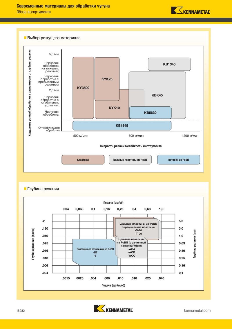 Современные материалы для обработки чугуна Обзор ассортимента Выбор режущего материала Ухудшение условий обработки в зависимости от глубины резания 5,0 мм Черновая обработка на тяжелых режимах Черновая обработка с прерывистым резанием 2,5 мм Черновая обработка в стабильных условиях Чистовая обработка Суперфинишная обработка 500 м/мин 800 м/мин 1200 м/мин Скорость резания/стойкость инструмента Керамика Цельные пластины из PcBN Вставки из PcBN Глубина резания Подача (мм/об) Цельные пластины из PcBN Глубина резания (дюйм) Керамические пластины -S-20 Глубина резания (мм) -T-20 Цельные пластины из PcBN (с зачистной кромкой Wiper) Пластины со вставками из PcBN -WCA -MT -WCB -C -WCC Подача (дюйм/об) B282 kennametal.com