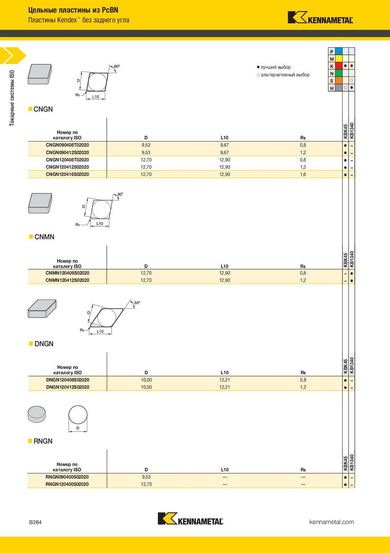 Цельные пластины из PcBN Пластины Kendex™ без заднего угла P M ⅷ лучший выбор K ⅷ ⅷ ISO ࠗ альтернативный выбор N системы S ࠗ H ࠗ ⅷ Токарные CNGN Номер по KBK45 KB1340 каталогу ISO D L10 R¡ CNGN090408T02020 9,53 9,67 0,8 ⅷ – CNGN090412S02020 9,53 9,67 1,2 ⅷ – CNGN120408T02020 12,70 12,90 0,8 ⅷ – CNGN120412S02020 12,70 12,90 1,2 ⅷ – CNGN120416S02020 12,70 12,90 1,6 ⅷ – CNMN Номер по KBK45 KB1340 каталогу ISO D L10 R¡ CNMN120408S02020 12,70 12,90 0,8 – ⅷ CNMN120412S02020 12,70 12,90 1,2 – ⅷ DNGN Номер по KBK45 KB1340 каталогу ISO D L10 R¡ DNGN120408S02020 10,00 12,21 0,8 ⅷ – DNGN120412S02020 10,00 12,21 1,2 ⅷ – RNGN Номер по KBK45 KB1340 каталогу ISO D L10 R¡ RNGN090400S02020 9,53 — — ⅷ – RNGN120400S02020 12,70 — — ⅷ – B284 kennametal.com