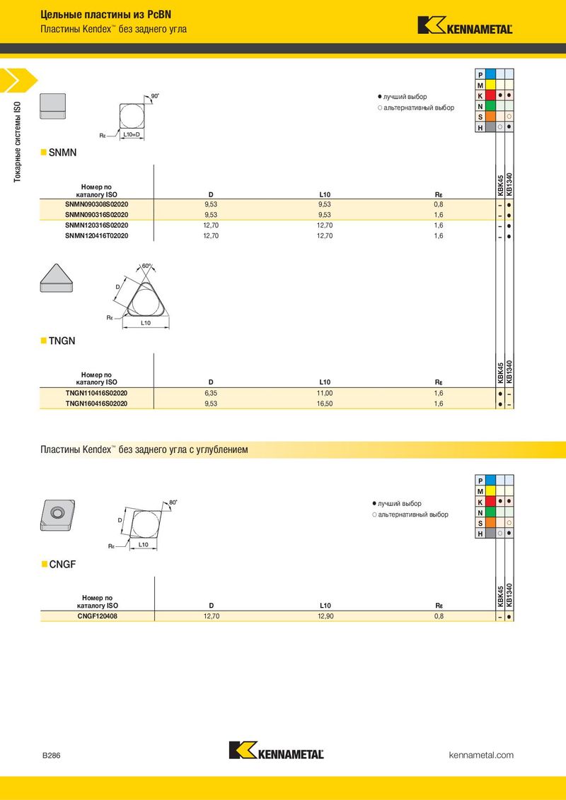 Цельные пластины из PcBN Пластины Kendex™ без заднего угла P M ⅷ лучший выбор K ⅷ ⅷ ISO ࠗ альтернативный выбор N системы S ࠗ H ࠗ ⅷ Токарные SNMN Номер по KBK45 KB1340 каталогу ISO D L10 R¡ SNMN090308S02020 9,53 9,53 0,8 – ⅷ SNMN090316S02020 9,53 9,53 1,6 – ⅷ SNMN120316S02020 12,70 12,70 1,6 – ⅷ SNMN120416T02020 12,70 12,70 1,6 – ⅷ TNGN Номер по KBK45 KB1340 каталогу ISO D L10 R¡ TNGN110416S02020 6,35 11,00 1,6 ⅷ – TNGN160416S02020 9,53 16,50 1,6 ⅷ – Пластины Kendex™ без заднего угла с углублением P M ⅷ лучший выбор K ⅷ ⅷ ࠗ альтернативный выбор N S ࠗ H ࠗ ⅷ CNGF Номер по KBK45 KB1340 каталогу ISO D L10 R¡ CNGF120408 12,70 12,90 0,8 – ⅷ B286 kennametal.com