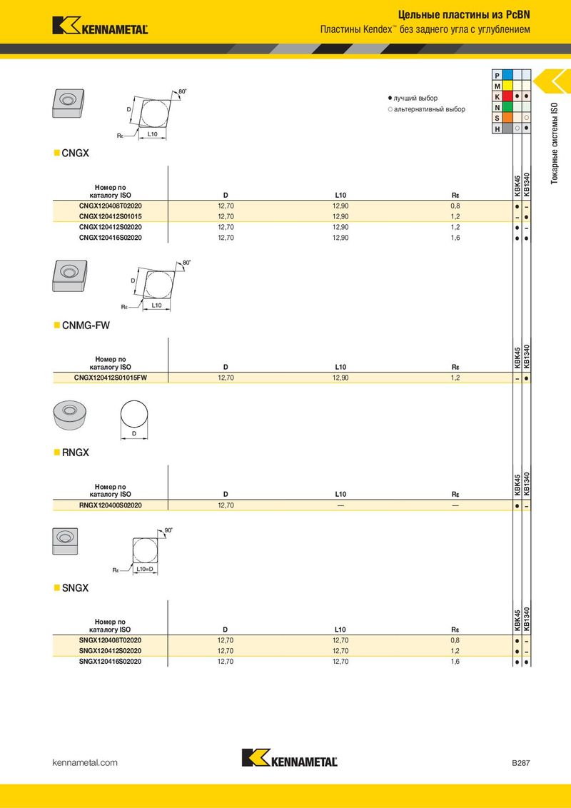 Цельные пластины из PcBN Пластины Kendex™ без заднего угла с углублением P M ⅷ лучший выбор K ⅷ ⅷ ࠗ альтернативный выбор N Токарные системы ISO S ࠗ H ࠗ ⅷ CNGX Номер по KBK45 KB1340 каталогу ISO D L10 R¡ CNGX120408T02020 12,70 12,90 0,8 ⅷ – CNGX120412S01015 12,70 12,90 1,2 – ⅷ CNGX120412S02020 12,70 12,90 1,2 ⅷ – CNGX120416S02020 12,70 12,90 1,6 ⅷ ⅷ CNMG-FW Номер по KBK45 KB1340 каталогу ISO D L10 R¡ CNGX120412S01015FW 12,70 12,90 1,2 – ⅷ RNGX Номер по KBK45 KB1340 каталогу ISO D L10 R¡ RNGX120400S02020 12,70 — — ⅷ – SNGX Номер по KBK45 KB1340 каталогу ISO D L10 R¡ SNGX120408T02020 12,70 12,70 0,8 ⅷ – SNGX120412S02020 12,70 12,70 1,2 ⅷ – SNGX120416S02020 12,70 12,70 1,6 ⅷ ⅷ kennametal.com B287