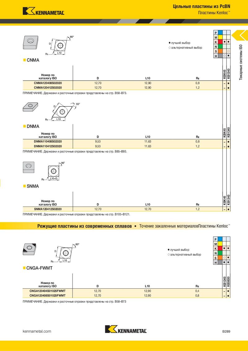 Цельные пластины из PcBN Пластины Kenloc™ P M ⅷ лучший выбор K ⅷ ⅷ ࠗ альтернативный выбор N Токарные системы ISO S ࠗ H ࠗ ⅷ CNMA Номер по KBK45 KB1340 каталогу ISO D L10 R¡ CNMA120408S02020 12,70 12,90 0,8 – ⅷ CNMA120412S02020 12,70 12,90 1,2 – ⅷ ПРИМЕЧАНИЕ. Державки и расточные оправки представлены на стр. B58–B73. DNMA KBK45 KB1340 Номер по каталогу ISO D L10 R¡ DNMA110408S02020 9,53 11,63 0,8 – ⅷ DNMA110412S02020 9,53 11,63 1,2 – ⅷ ПРИМЕЧАНИЕ. Державки и расточные оправки представлены на стр. B85–B93. SNMA Номер по KBK45 KB1340 каталогу ISO D L10 R¡ SNMA120412S02020 12,70 12,70 1,2 – ⅷ ПРИМЕЧАНИЕ. Державки и расточные оправки представлены на стр. B105–B121. Режущие пластины из современных сплавов • Точение закаленных материаловПластины Kenloc™ P M ⅷ лучший выбор K ⅷ ⅷ ࠗ альтернативный выбор N S ࠗ ⅷ H ⅷ ⅷ CNGA-FWMT Номер по KB1345 KB5630 каталогу ISO D L10 R¡ CNGA120404S01025FWMT 12,70 12,90 0,4 – ⅷ CNGA120408S01025FWMT 12,70 12,90 0,8 – ⅷ ПРИМЕЧАНИЕ. Державки и расточные оправки представлены на стр. B58–B73 kennametal.com B289