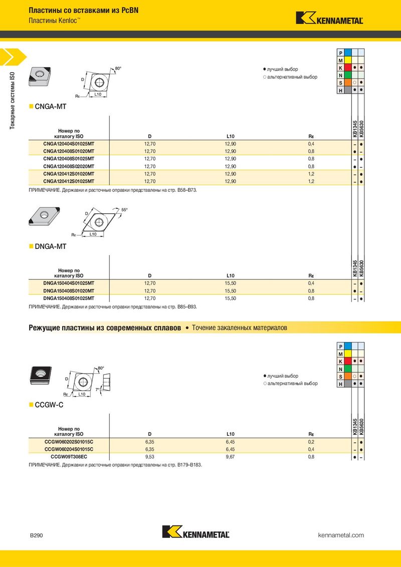 Пластины со вставками из PcBN Пластины Kenloc™ P M ⅷ лучший выбор K ⅷ ⅷ ISO ࠗ альтернативный выбор N системы S ࠗ ⅷ H ⅷ ⅷ Токарные CNGA-MT Номер по KB1345 KB5630 каталогу ISO D L10 R¡ CNGA120404S01025MT 12,70 12,90 0,4 – ⅷ CNGA120408S01020MT 12,70 12,90 0,8 ⅷ – CNGA120408S01025MT 12,70 12,90 0,8 – ⅷ CNGA120408S02020MT 12,70 12,90 0,8 ⅷ – CNGA120412S01020MT 12,70 12,90 1,2 – ⅷ CNGA120412S01025MT 12,70 12,90 1,2 – ⅷ ПРИМЕЧАНИЕ. Державки и расточные оправки представлены на стр. B58–B73. DNGA-MT Номер по KB1345 KB5630 каталогу ISO D L10 R¡ DNGA150404S01025MT 12,70 15,50 0,4 – ⅷ DNGA150408S01020MT 12,70 15,50 0,8 ⅷ – DNGA150408S01025MT 12,70 15,50 0,8 – ⅷ ПРИМЕЧАНИЕ. Державки и расточные оправки представлены на стр. B85–B93. Режущие пластины из современных сплавов • Точение закаленных материалов P M K ⅷ ⅷ N ⅷ лучший выбор S ࠗ ⅷ ࠗ альтернативный выбор H ⅷ ⅷ CCGW-C Номер по KB1345 KB5630 каталогу ISO D L10 R¡ CCGW060202S01015C 6,35 6,45 0,2 – ⅷ CCGW060204S01015C 6,35 6,45 0,4 – ⅷ CCGW09T308EC 9,53 9,67 0,8 ⅷ – ПРИМЕЧАНИЕ. Державки и расточные оправки представлены на стр. B179–B183. B290 kennametal.com