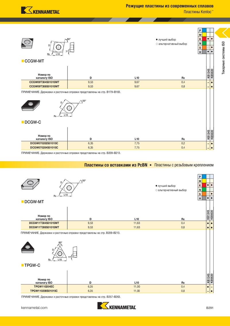 Режущие пластины из современных сплавов Пластины Kenloc™ P M ⅷ лучший выбор K ⅷ ⅷ ࠗ альтернативный выбор N Токарные системы ISO S ࠗ ⅷ H ⅷ ⅷ CCGW-MT Номер по KB1345 KB5630 каталогу ISO D L10 R¡ CCGW09T304S01015MT 9,53 9,67 0,4 – ⅷ CCGW09T308S01015MT 9,53 9,67 0,8 – ⅷ ПРИМЕЧАНИЕ. Державки и расточные оправки представлены на стр. B179–B183. DCGW-C Номер по KB1345 KB5630 каталогу ISO D L10 R¡ DCGW070202S01015C 6,35 7,75 0,2 – ⅷ DCGW070204S01015C 6,35 7,75 0,4 – ⅷ ПРИМЕЧАНИЕ. Державки и расточные оправки представлены на стр. B209–B213. Пластины со вставками из PcBN • Пластины с резьбовым креплением P M ⅷ лучший выбор K ⅷ ⅷ ࠗ альтернативный выбор N S ࠗ ⅷ H ⅷ ⅷ DCGW-MT Номер по KB1345 KB5630 каталогу ISO D L10 R¡ DCGW11T304S01015MT 9,53 11,63 0,4 ⅷ ⅷ DCGW11T308S01015MT 9,53 11,63 0,8 ⅷ ⅷ ПРИМЕЧАНИЕ. Державки и расточные оправки представлены на стр. B209–B213. TPGW-C Номер по KB1345 KB5630 каталогу ISO D L10 R¡ TPGW110204EC 6,35 11,00 0,4 ⅷ – TPGW110208S01015C 6,35 11,00 0,8 – ⅷ ПРИМЕЧАНИЕ. Державки и расточные оправки представлены на стр. B257–B263. kennametal.com B291