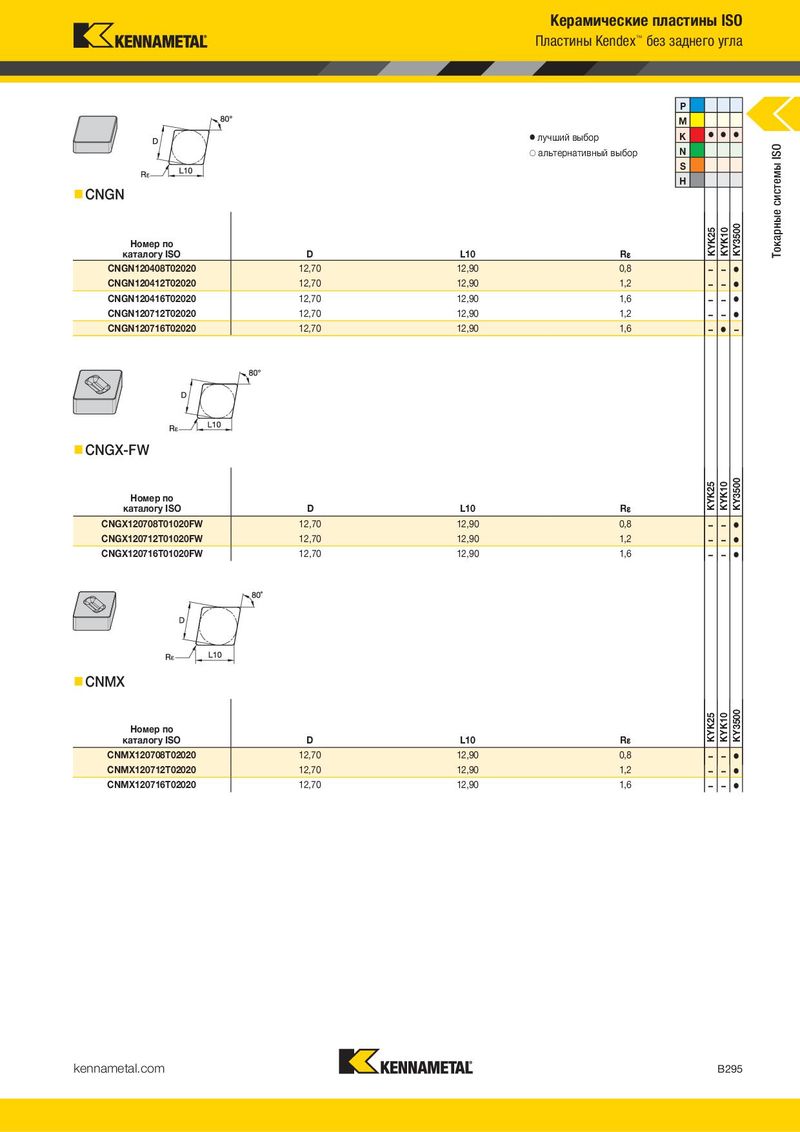 Керамические пластины ISO Пластины Kendex™ без заднего угла P M ⅷ лучший выбор K ⅷ ⅷ ⅷ ࠗ альтернативный выбор N Токарные системы ISO S H CNGN Номер по KYK25 KYK10 KY3500 каталогу ISO D L10 R¡ CNGN120408T02020 12,70 12,90 0,8 – – ⅷ CNGN120412T02020 12,70 12,90 1,2 – – ⅷ CNGN120416T02020 12,70 12,90 1,6 – – ⅷ CNGN120712T02020 12,70 12,90 1,2 – – ⅷ CNGN120716T02020 12,70 12,90 1,6 – ⅷ – CNGX-FW Номер по KYK25 KYK10 KY3500 каталогу ISO D L10 R¡ CNGX120708T01020FW 12,70 12,90 0,8 – – ⅷ CNGX120712T01020FW 12,70 12,90 1,2 – – ⅷ CNGX120716T01020FW 12,70 12,90 1,6 – – ⅷ CNMX Номер по KYK25 KYK10 KY3500 каталогу ISO D L10 R¡ CNMX120708T02020 12,70 12,90 0,8 – – ⅷ CNMX120712T02020 12,70 12,90 1,2 – – ⅷ CNMX120716T02020 12,70 12,90 1,6 – – ⅷ kennametal.com B295