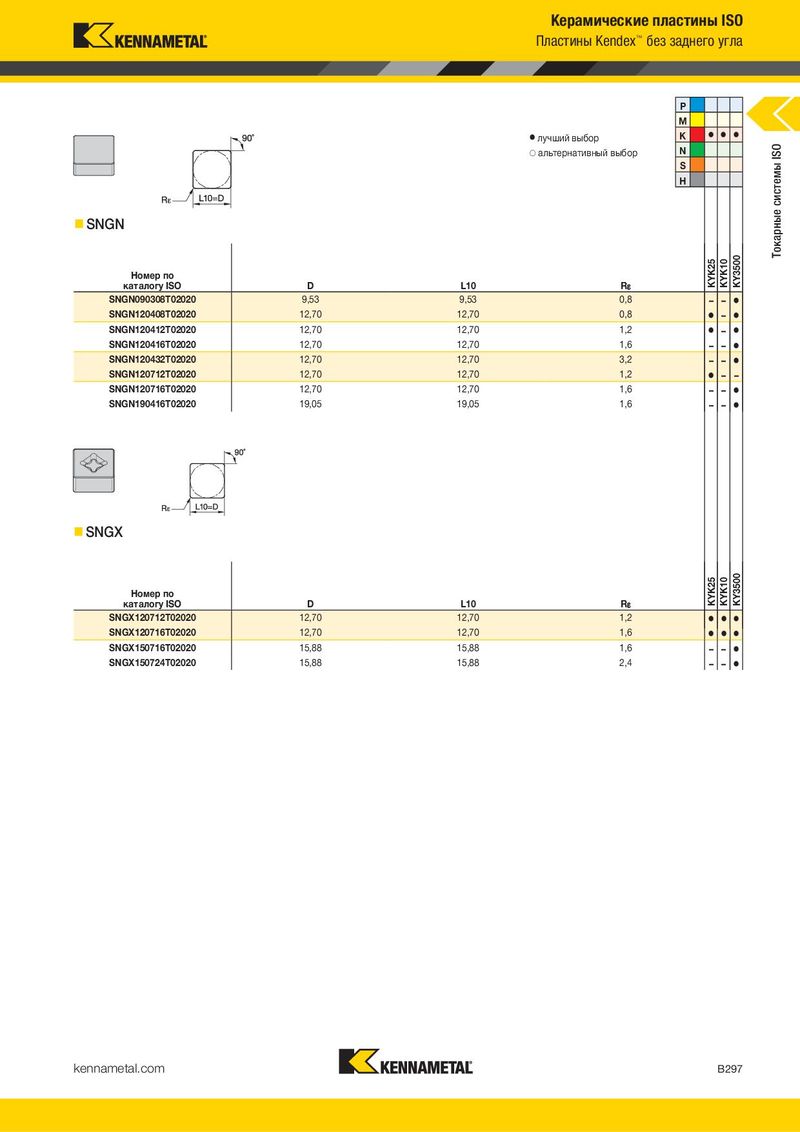 Керамические пластины ISO Пластины Kendex™ без заднего угла P M ⅷ лучший выбор K ⅷ ⅷ ⅷ ࠗ альтернативный выбор N Токарные системы ISO S H SNGN Номер по KYK25 KYK10 KY3500 каталогу ISO D L10 R¡ SNGN090308T02020 9,53 9,53 0,8 – – ⅷ SNGN120408T02020 12,70 12,70 0,8 ⅷ – ⅷ SNGN120412T02020 12,70 12,70 1,2 ⅷ – ⅷ SNGN120416T02020 12,70 12,70 1,6 – – ⅷ SNGN120432T02020 12,70 12,70 3,2 – – ⅷ SNGN120712T02020 12,70 12,70 1,2 ⅷ – – SNGN120716T02020 12,70 12,70 1,6 – – ⅷ SNGN190416T02020 19,05 19,05 1,6 – – ⅷ SNGX Номер по KYK25 KYK10 KY3500 каталогу ISO D L10 R¡ SNGX120712T02020 12,70 12,70 1,2 ⅷ ⅷ ⅷ SNGX120716T02020 12,70 12,70 1,6 ⅷ ⅷ ⅷ SNGX150716T02020 15,88 15,88 1,6 – – ⅷ SNGX150724T02020 15,88 15,88 2,4 – – ⅷ kennametal.com B297