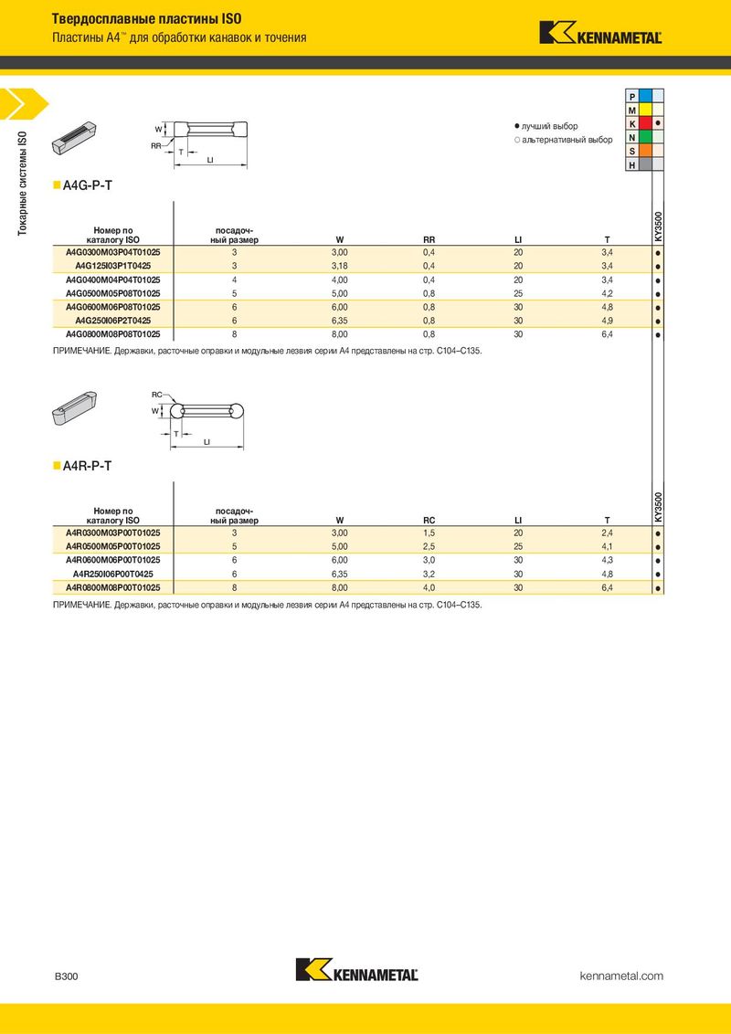 Твердосплавные пластины ISO Пластины A4™ для обработки канавок и точения P M ⅷ лучший выбор K ⅷ ISO ࠗ альтернативный выбор N системы S H Токарные A4G-P-T Номер по посадоч- KY3500 каталогу ISO ный размер W RR LI T A4G0300M03P04T01025 3 3,00 0,4 20 3,4 ⅷ A4G125I03P1T0425 3 3,18 0,4 20 3,4 ⅷ A4G0400M04P04T01025 4 4,00 0,4 20 3,4 ⅷ A4G0500M05P08T01025 5 5,00 0,8 25 4,2 ⅷ A4G0600M06P08T01025 6 6,00 0,8 30 4,8 ⅷ A4G250I06P2T0425 6 6,35 0,8 30 4,9 ⅷ A4G0800M08P08T01025 8 8,00 0,8 30 6,4 ⅷ ПРИМЕЧАНИЕ. Державки, расточные оправки и модульные лезвия серии A4 представлены на стр. C104–C135. A4R-P-T Номер по посадоч- KY3500 каталогу ISO ный размер W RC LI T A4R0300M03P00T01025 3 3,00 1,5 20 2,4 ⅷ A4R0500M05P00T01025 5 5,00 2,5 25 4,1 ⅷ A4R0600M06P00T01025 6 6,00 3,0 30 4,3 ⅷ A4R250I06P00T0425 6 6,35 3,2 30 4,8 ⅷ A4R0800M08P00T01025 8 8,00 4,0 30 6,4 ⅷ ПРИМЕЧАНИЕ. Державки, расточные оправки и модульные лезвия серии A4 представлены на стр. C104–C135. B300 kennametal.com