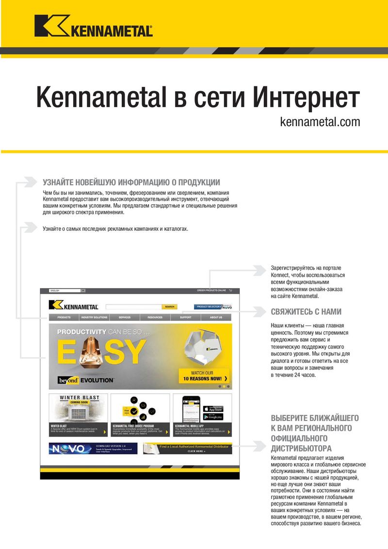 Kennametal в сети Интернет kennametal.com УЗНАЙТЕ НОВЕЙШУЮ ИНФОРМАЦИЮ О ПРОДУКЦИИ Чем бы вы ни занимались, точением, фрезерованием или сверлением, компания Kennametal предоставит вам высокопроизводительный инструмент, отвечающий вашим конкретным условиям. Мы предлагаем стандартные и специальные решения для широкого спектра применения. Узнайте о самых последних рекламных кампаниях и каталогах. Зарегистрируйтесь на портале Konnect, чтобы воспользоваться всеми функциональными возможностями онлайн-заказа на сайте Kennametal. СВЯЖИТЕСЬ С НАМИ Наши клиенты — наша главная ценность. Поэтому мы стремимся предложить вам сервис и техническую поддержку самого высокого уровня. Мы открыты для диалога и готовы ответить на все ваши вопросы и замечания в течение 24 часов. ВЫБЕРИТЕ БЛИЖАЙШЕГО К ВАМ РЕГИОНАЛЬНОГО ОФИЦИАЛЬНОГО ДИСТРИБЬЮТОРА Kennametal предлагает изделия мирового класса и глобальное сервисное обслуживание. Наши дистрибьюторы хорошо знакомы с нашей продукцией, но еще лучше они знают ваши потребности. Они в состоянии найти грамотное применение глобальным ресурсам компании Kennametal в ваших конкретных условиях — на вашем производстве, в вашем регионе, способствуя развитию вашего бизнеса.