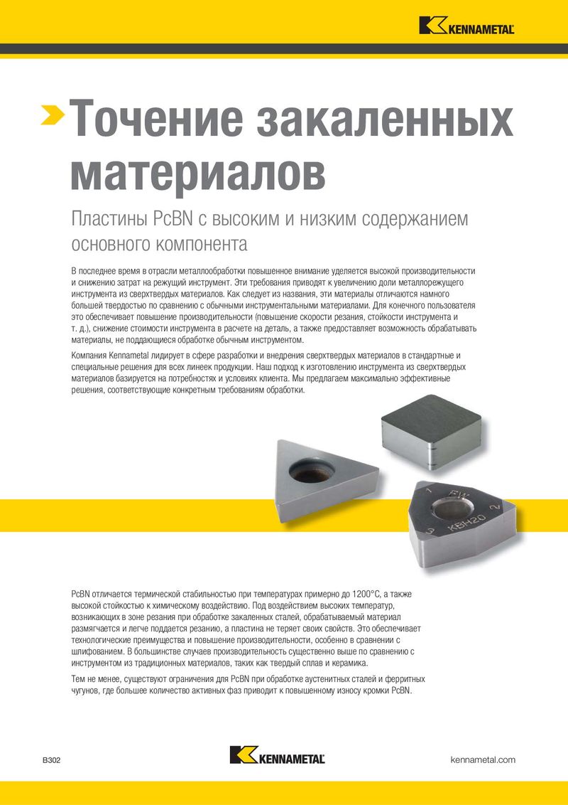 Точение закаленных материалов Пластины PcBN с высоким и низким содержанием основного компонента В последнее время в отрасли металлообработки повышенное внимание уделяется высокой производительности и снижению затрат на режущий инструмент. Эти требования приводят к увеличению доли металлорежущего инструмента из сверхтвердых материалов. Как следует из названия, эти материалы отличаются намного большей твердостью по сравнению с обычными инструментальными материалами. Для конечного пользователя это обеспечивает повышение производительности (повышение скорости резания, стойкости инструмента и т. д.), снижение стоимости инструмента в расчете на деталь, а также предоставляет возможность обрабатывать материалы, не поддающиеся обработке обычным инструментом. Компания Kennametal лидирует в сфере разработки и внедрения сверхтвердых материалов в стандартные и специальные решения для всех линеек продукции. Наш подход к изготовлению инструмента из сверхтвердых материалов базируется на потребностях и условиях клиента. Мы предлагаем максимально эффективные решения, соответствующие конкретным требованиям обработки. PcBN отличается термической стабильностью при температурах примерно до 1200°С, а также высокой стойкостью к химическому воздействию. Под воздействием высоких температур, возникающих в зоне резания при обработке закаленных сталей, обрабатываемый материал размягчается и легче поддается резанию, а пластина не теряет своих свойств. Это обеспечивает технологические преимущества и повышение производительности, особенно в сравнении с шлифованием. В большинстве случаев производительность существенно выше по сравнению с инструментом из традиционных материалов, таких как твердый сплав и керамика. Тем не менее, существуют ограничения для PcBN при обработке аустенитных сталей и ферритных чугунов, где большее количество активных фаз приводит к повышенному износу кромки PcBN. B302 kennametal.com