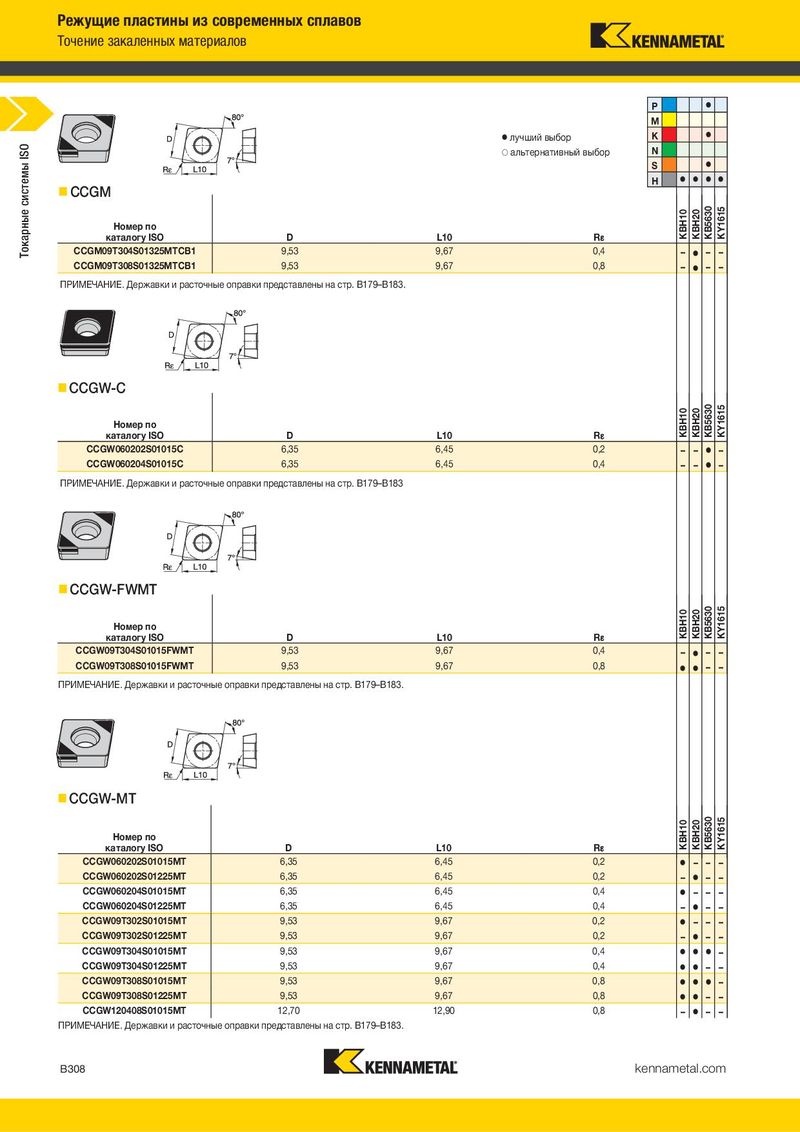 Режущие пластины из современных сплавов Точение закаленных материалов P ⅷ M ⅷ лучший выбор K ⅷ ISO ࠗ альтернативный выбор N Токарные системы S ⅷ H ⅷ ⅷ ⅷ ⅷ CCGM Номер по KBH10 KBH20 KB5630 KY1615 каталогу ISO D L10 R¡ CCGM09T304S01325MTCB1 9,53 9,67 0,4 – ⅷ – – CCGM09T308S01325MTCB1 9,53 9,67 0,8 – ⅷ – – ПРИМЕЧАНИЕ. Державки и расточные оправки представлены на стр. B179–B183. CCGW-C Номер по KBH10 KBH20 KB5630 KY1615 каталогу ISO D L10 R¡ CCGW060202S01015C 6,35 6,45 0,2 – – ⅷ – CCGW060204S01015C 6,35 6,45 0,4 – – ⅷ – ПРИМЕЧАНИЕ. Державки и расточные оправки представлены на стр. B179–B183 CCGW-FWMT Номер по KBH10 KBH20 KB5630 KY1615 каталогу ISO D L10 R¡ CCGW09T304S01015FWMT 9,53 9,67 0,4 – ⅷ – – CCGW09T308S01015FWMT 9,53 9,67 0,8 ⅷ ⅷ – – ПРИМЕЧАНИЕ. Державки и расточные оправки представлены на стр. B179–B183. CCGW-MT Номер по KBH10 KBH20 KB5630 KY1615 каталогу ISO D L10 R¡ CCGW060202S01015MT 6,35 6,45 0,2 ⅷ – – – CCGW060202S01225MT 6,35 6,45 0,2 – ⅷ – – CCGW060204S01015MT 6,35 6,45 0,4 ⅷ – – – CCGW060204S01225MT 6,35 6,45 0,4 – ⅷ – – CCGW09T302S01015MT 9,53 9,67 0,2 ⅷ – – – CCGW09T302S01225MT 9,53 9,67 0,2 – ⅷ – – CCGW09T304S01015MT 9,53 9,67 0,4 ⅷ ⅷ ⅷ – CCGW09T304S01225MT 9,53 9,67 0,4 ⅷ ⅷ – – CCGW09T308S01015MT 9,53 9,67 0,8 ⅷ ⅷ ⅷ – CCGW09T308S01225MT 9,53 9,67 0,8 ⅷ ⅷ – – CCGW120408S01015MT 12,70 12,90 0,8 – ⅷ – – ПРИМЕЧАНИЕ. Державки и расточные оправки представлены на стр. B179–B183. B308 kennametal.com