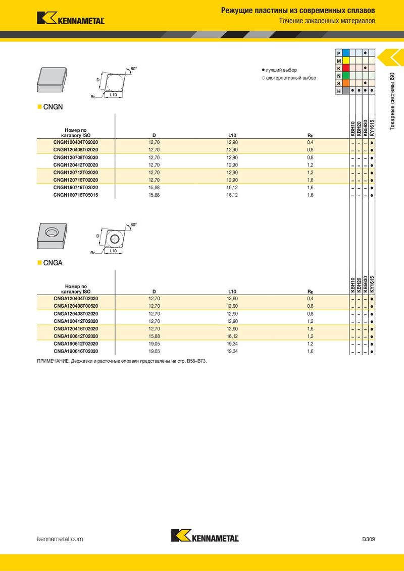 Режущие пластины из современных сплавов Точение закаленных материалов P ⅷ M ⅷ лучший выбор K ⅷ ࠗ альтернативный выбор N Токарные системы ISO S ⅷ H ⅷ ⅷ ⅷ ⅷ CNGN Номер по KBH10 KBH20 KB5630 KY1615 каталогу ISO D L10 R¡ CNGN120404T02020 12,70 12,90 0,4 – – – ⅷ CNGN120408T02020 12,70 12,90 0,8 – – – ⅷ CNGN120708T02020 12,70 12,90 0,8 – – – ⅷ CNGN120412T02020 12,70 12,90 1,2 – – – ⅷ CNGN120712T02020 12,70 12,90 1,2 – – – ⅷ CNGN120716T02020 12,70 12,90 1,6 – – – ⅷ CNGN160716T02020 15,88 16,12 1,6 – – – ⅷ CNGN160716T05015 15,88 16,12 1,6 – – – ⅷ CNGA Номер по KBH10 KBH20 KB5630 KY1615 каталогу ISO D L10 R¡ CNGA120404T02020 12,70 12,90 0,4 – – – ⅷ CNGA120408T00520 12,70 12,90 0,8 – – – ⅷ CNGA120408T02020 12,70 12,90 0,8 – – – ⅷ CNGA120412T02020 12,70 12,90 1,2 – – – ⅷ CNGA120416T02020 12,70 12,90 1,6 – – – ⅷ CNGA160612T02020 15,88 16,12 1,2 – – – ⅷ CNGA190612T02020 19,05 19,34 1,2 – – – ⅷ CNGA190616T02020 19,05 19,34 1,6 – – – ⅷ ПРИМЕЧАНИЕ. Державки и расточные оправки представлены на стр. B58–B73. kennametal.com B309