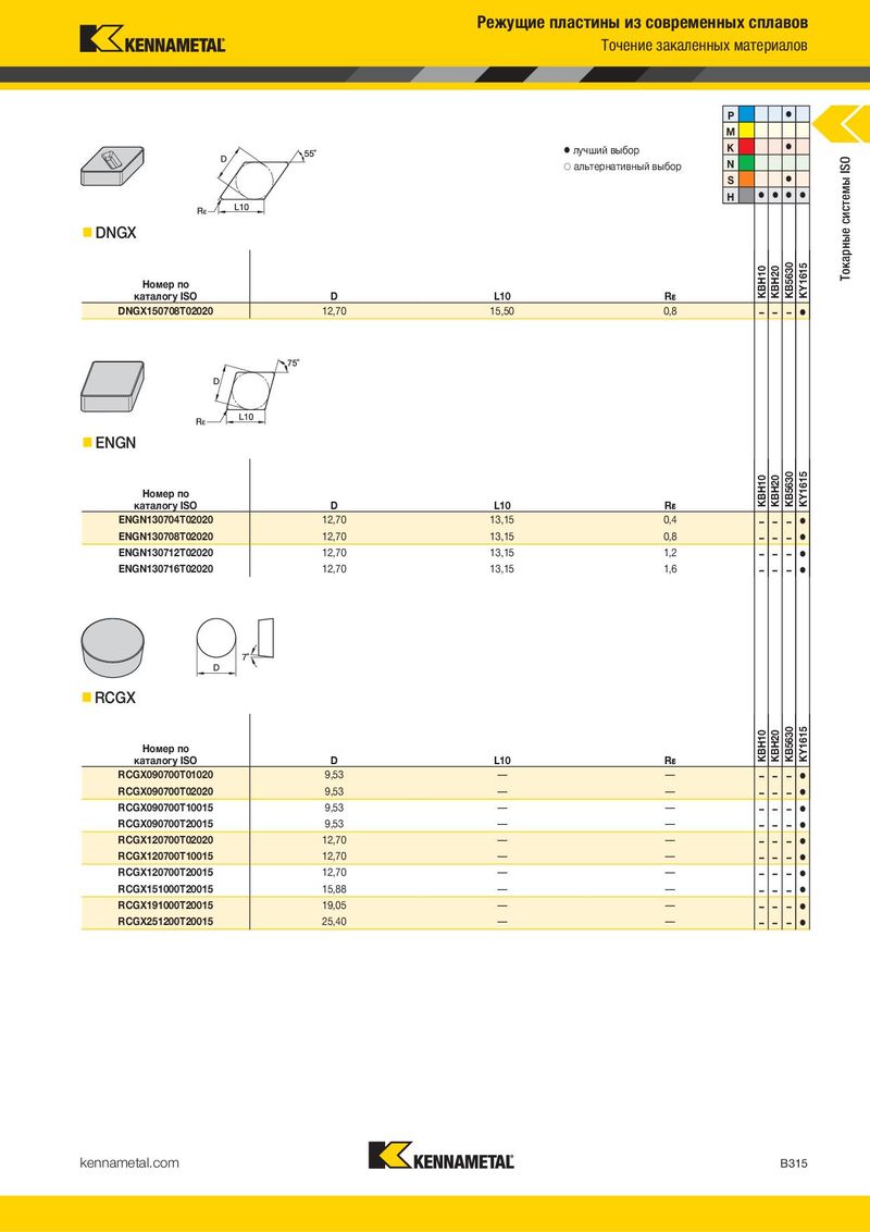 Режущие пластины из современных сплавов Точение закаленных материалов P ⅷ M ⅷ лучший выбор K ⅷ ࠗ альтернативный выбор N Токарные системы ISO S ⅷ H ⅷ ⅷ ⅷ ⅷ DNGX Номер по KBH10 KBH20 KB5630 KY1615 каталогу ISO D L10 R¡ DNGX150708T02020 12,70 15,50 0,8 – – – ⅷ ENGN Номер по KBH10 KBH20 KB5630 KY1615 каталогу ISO D L10 R¡ ENGN130704T02020 12,70 13,15 0,4 – – – ⅷ ENGN130708T02020 12,70 13,15 0,8 – – – ⅷ ENGN130712T02020 12,70 13,15 1,2 – – – ⅷ ENGN130716T02020 12,70 13,15 1,6 – – – ⅷ RCGX Номер по KBH10 KBH20 KB5630 KY1615 каталогу ISO D L10 R¡ RCGX090700T01020 9,53 — — – – – ⅷ RCGX090700T02020 9,53 — — – – – ⅷ RCGX090700T10015 9,53 — — – – – ⅷ RCGX090700T20015 9,53 — — – – – ⅷ RCGX120700T02020 12,70 — — – – – ⅷ RCGX120700T10015 12,70 — — – – – ⅷ RCGX120700T20015 12,70 — — – – – ⅷ RCGX151000T20015 15,88 — — – – – ⅷ RCGX191000T20015 19,05 — — – – – ⅷ RCGX251200T20015 25,40 — — – – – ⅷ kennametal.com B315