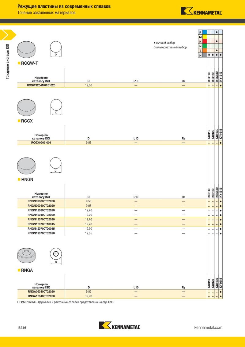 Режущие пластины из современных сплавов Точение закаленных материалов P ⅷ M ⅷ лучший выбор K ⅷ ISO ࠗ альтернативный выбор N системы S ⅷ H ⅷ ⅷ ⅷ ⅷ Токарные RCGW-T Номер по KBH10 KBH20 KB5630 KY1615 каталогу ISO D L10 R¡ RCGW1204M0T01020 12,00 — — – – – ⅷ RCGX Номер по KBH10 KBH20 KB5630 KY1615 каталогу ISO D L10 R¡ RCGX0907-001 9,53 — — – – – ⅷ RNGN Номер по KBH10 KBH20 KB5630 KY1615 каталогу ISO D L10 R¡ RNGN090300T02020 9,53 — — – – – ⅷ RNGN090400T02020 9,53 — — – – – ⅷ RNGN120300T02020 12,70 — — – – – ⅷ RNGN120400T02020 12,70 — — – – – ⅷ RNGN120700T02020 12,70 — — – – – ⅷ RNGN120700T10015 12,70 — — – – – ⅷ RNGN120700T20015 12,70 — — – – – ⅷ RNGN190700T02020 19,05 — — – – – ⅷ RNGA Номер по KBH10 KBH20 KB5630 KY1615 каталогу ISO D L10 R¡ RNGA090300T02020 9,53 — — – – – ⅷ RNGA120400T02020 12,70 — — – – – ⅷ ПРИМЕЧАНИЕ. Державки и расточные оправки представлены на стр. B95. B316 kennametal.com