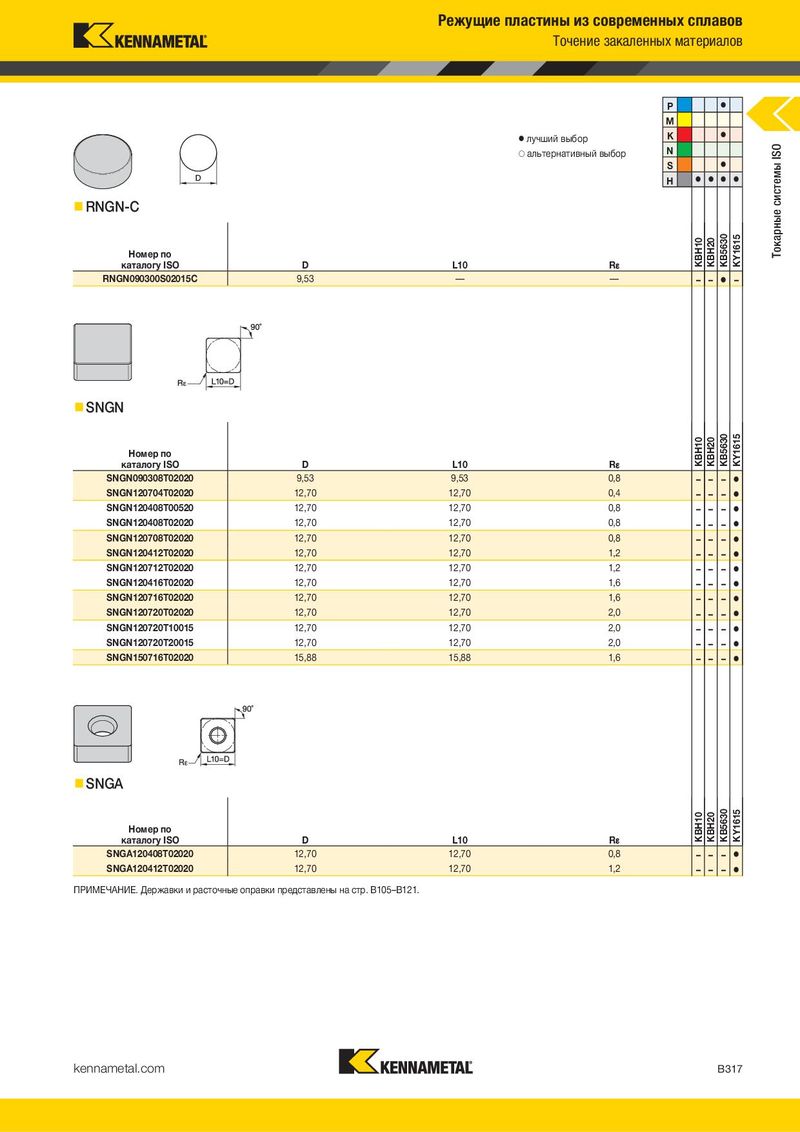 Режущие пластины из современных сплавов Точение закаленных материалов P ⅷ M ⅷ лучший выбор K ⅷ ࠗ альтернативный выбор N Токарные системы ISO S ⅷ H ⅷ ⅷ ⅷ ⅷ RNGN-C Номер по KBH10 KBH20 KB5630 KY1615 каталогу ISO D L10 R¡ RNGN090300S02015C 9,53 — — – – ⅷ – SNGN Номер по KBH10 KBH20 KB5630 KY1615 каталогу ISO D L10 R¡ SNGN090308T02020 9,53 9,53 0,8 – – – ⅷ SNGN120704T02020 12,70 12,70 0,4 – – – ⅷ SNGN120408T00520 12,70 12,70 0,8 – – – ⅷ SNGN120408T02020 12,70 12,70 0,8 – – – ⅷ SNGN120708T02020 12,70 12,70 0,8 – – – ⅷ SNGN120412T02020 12,70 12,70 1,2 – – – ⅷ SNGN120712T02020 12,70 12,70 1,2 – – – ⅷ SNGN120416T02020 12,70 12,70 1,6 – – – ⅷ SNGN120716T02020 12,70 12,70 1,6 – – – ⅷ SNGN120720T02020 12,70 12,70 2,0 – – – ⅷ SNGN120720T10015 12,70 12,70 2,0 – – – ⅷ SNGN120720T20015 12,70 12,70 2,0 – – – ⅷ SNGN150716T02020 15,88 15,88 1,6 – – – ⅷ SNGA Номер по KBH10 KBH20 KB5630 KY1615 каталогу ISO D L10 R¡ SNGA120408T02020 12,70 12,70 0,8 – – – ⅷ SNGA120412T02020 12,70 12,70 1,2 – – – ⅷ ПРИМЕЧАНИЕ. Державки и расточные оправки представлены на стр. B105–B121. kennametal.com B317