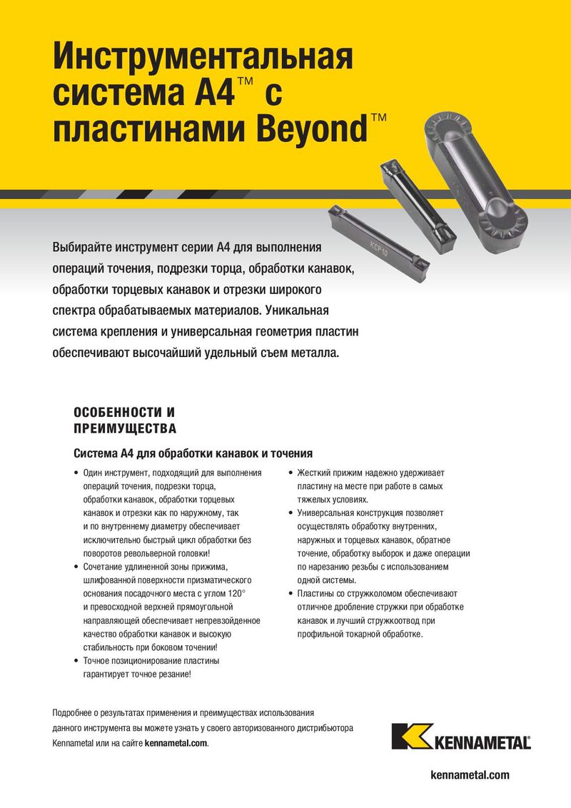 Инструментальная система A4™ с пластинами Beyond™ Выбирайте инструмент серии A4 для выполнения операций точения, подрезки торца, обработки канавок, обработки торцевых канавок и отрезки широкого спектра обрабатываемых материалов. Уникальная система крепления и универсальная геометрия пластин обеспечивают высочайший удельный съем металла. ОСОБЕННОСТИ И ПРЕИМУЩЕСТВА Система A4 для обработки канавок и точения • Один инструмент, подходящий для выполнения • Жесткий прижим надежно удерживает операций точения, подрезки торца, пластину на месте при работе в самых обработки канавок, обработки торцевых тяжелых условиях. канавок и отрезки как по наружному, так • Универсальная конструкция позволяет и по внутреннему диаметру обеспечивает осуществлять обработку внутренних, исключительно быстрый цикл обработки без наружных и торцевых канавок, обратное поворотов револьверной головки! точение, обработку выборок и даже операции • Сочетание удлиненной зоны прижима, по нарезанию резьбы с использованием шлифованной поверхности призматического одной системы. основания посадочного места с углом 120° • Пластины со стружколомом обеспечивают и превосходной верхней прямоугольной отличное дробление стружки при обработке направляющей обеспечивает непревзойденное канавок и лучший стружкоотвод при качество обработки канавок и высокую профильной токарной обработке. стабильность при боковом точении! • Точное позиционирование пластины гарантирует точное резание! Подробнее о результатах применения и преимуществах использования данного инструмента вы можете узнать у своего авторизованного дистрибьютора Kennametal или на сайте kennametal.com. kennametal.com