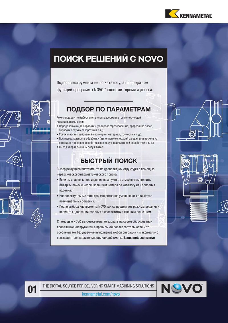 ПОИСК РЕШЕНИЙ С NOVO Подбор инструмента не по каталогу, а посредством функций программы NOVO™ экономит время и деньги. ПОДБОР ПО ПАРАМЕТРАМ Рекомендации по выбору инструмента формируются в следующей последовательности: • Определение вида обработки (торцевое фрезерование, прорезание пазов, обработка глухих отверстий и т. д.). • Совокупность требований (геометрия, материал, точность и т. д.). • Последовательность обработки (выполнение операций за один или несколько проходов, черновая обработка с последующей чистовой обработкой и т. д.). • Вывод упорядоченных результатов. БЫСТРЫЙ ПОИСК Выбор режущего инструмента из древовидной структуры с помощью иерархического/параметрического поиска: • Если вы знаете, какое изделие вам нужно, вы можете выполнить быстрый поиск с использованием номера по каталогу или описания изделия. • Интеллектуальные фильтры существенно уменьшают количество потенциальных решений. • После выбора инструмента NOVO также предлагает режимы резания и варианты адаптации изделия в соответствии с вашим решением. С помощью NOVO вы сможете использовать на своем оборудовании правильные инструменты в правильной последовательности. Это обеспечивает безупречное выполнение любой операции и максимально повышает производительность каждой смены. kennametal.com/novo kennametal.com/novo