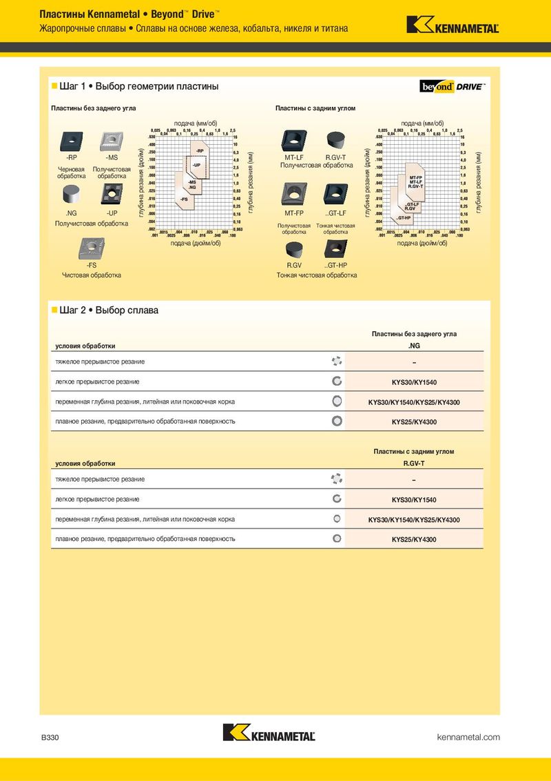 Пластины Kennametal • Beyond™ Drive™ Жаропрочные сплавы • Сплавы на основе железа, кобальта, никеля и титана Шаг 1 • Выбор геометрии пластины Пластины без заднего угла Пластины с задним углом подача (мм/об) подача (мм/об) -RP -MS глубина резания (дюйм) глубина резания (мм) MT-LF R.GV-T глубина резания (дюйм) глубина резания (мм) Черновая Получистовая Получистовая обработка обработка обработка .NG -UP MT-FP ..GT-LF Получистовая обработка Получистовая Тонкая чистовая обработка обработка подача (дюйм/об) подача (дюйм/об) -FS R.GV ..GT-HP Чистовая обработка Тонкая чистовая обработка Шаг 2 • Выбор сплава Пластины без заднего угла условия обработки .NG тяжелое прерывистое резание – легкое прерывистое резание KYS30/KY1540 переменная глубина резания, литейная или поковочная корка KYS30/KY1540/KYS25/KY4300 плавное резание, предварительно обработанная поверхность KYS25/KY4300 Пластины с задним углом условия обработки R.GV-T тяжелое прерывистое резание – легкое прерывистое резание KYS30/KY1540 переменная глубина резания, литейная или поковочная корка KYS30/KY1540/KYS25/KY4300 плавное резание, предварительно обработанная поверхность KYS25/KY4300 B330 kennametal.com