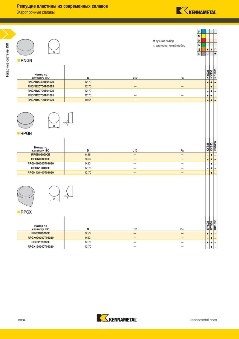 Режущие пластины из современных сплавов Жаропрочные сплавы P M ⅷ лучший выбор K ISO ࠗ альтернативный выбор N системы S ⅷ ⅷ ࠗ H ࠗ ⅷ Токарные RNGN Номер по KYS25 KYS30 KB1630 каталогу ISO D L10 R¡ RNGN120400T01020 12,70 — — – ⅷ – RNGN120700T00525 12,70 — — – ⅷ – RNGN120700T01020 12,70 — — – ⅷ – RNGN120700T01025 12,70 — — ⅷ ⅷ – RNGN190700T01020 19,05 — — – ⅷ – RPGN Номер по KYS25 KYS30 KB1630 каталогу ISO D L10 R¡ RPGN060200E 6,35 — — – ⅷ – RPGN090300E 9,53 — — – ⅷ – RPGN090300T01020 9,53 — — – ⅷ – RPGN120400E 12,70 — — – ⅷ – RPGN120400T01020 12,70 — — – ⅷ – RPGX Номер по KYS25 KYS30 KB1630 каталогу ISO D L10 R¡ RPGX090700E 9,53 — — ⅷ ⅷ – RPGX090700T01020 9,53 — — – ⅷ – RPGX120700E 12,70 — — ⅷ ⅷ – RPGX120700T01020 12,70 — — – ⅷ – B334 kennametal.com