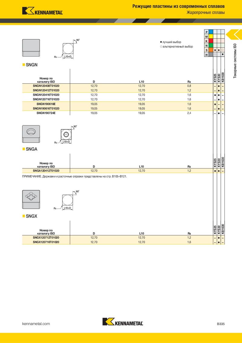 Режущие пластины из современных сплавов Жаропрочные сплавы P M ⅷ лучший выбор K ࠗ альтернативный выбор N Токарные системы ISO S ⅷ ⅷ ࠗ H ࠗ ⅷ SNGN Номер по KYS25 KYS30 KB1630 каталогу ISO D L10 R¡ SNGN120408T01020 12,70 12,70 0,8 – ⅷ – SNGN120412T01020 12,70 12,70 1,2 – ⅷ – SNGN120416T01020 12,70 12,70 1,6 ⅷ ⅷ – SNGN120716T01020 12,70 12,70 1,6 – ⅷ – SNGN190616E 19,05 19,05 1,6 ⅷ – – SNGN190616T01020 19,05 19,05 1,6 – ⅷ – SNGN190724E 19,05 19,05 2,4 – ⅷ – SNGA Номер по KYS25 KYS30 KB1630 каталогу ISO D L10 R¡ SNGA120412T01020 12,70 12,70 1,2 ⅷ ⅷ – ПРИМЕЧАНИЕ. Державки и расточные оправки представлены на стр. B105–B121. SNGX Номер по KYS25 KYS30 KB1630 каталогу ISO D L10 R¡ SNGX120712T01020 12,70 12,70 1,2 – ⅷ – SNGX120716T01020 12,70 12,70 1,6 – ⅷ – kennametal.com B335