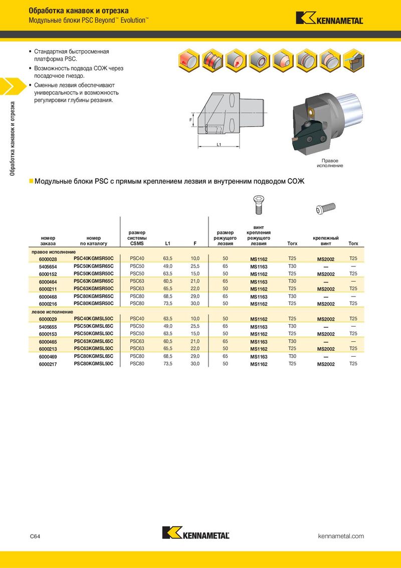 Обработка канавок и отрезка Модульные блоки PSC Beyond™ Evolution™ • Стандартная быстросменная платформа PSC. • Возможность подвода СОЖ через посадочное гнездо. • Сменные лезвия обеспечивают универсальность и возможность Обработка канавок и отрезка регулировки глубины резания. Правое исполнение Модульные блоки PSC с прямым креплением лезвия и внутренним подводом СОЖ винт размер размер крепления номер номер системы режущего режущего крепежный заказа по каталогу CSMS L1 F лезвия лезвия Torx винт Torx правое исполнение 6000028 PSC40KGMSR50C PSC40 63,5 10,0 50 MS1162 T25 MS2002 T25 5405654 PSC50KGMSR65C PSC50 49,0 25,5 65 MS1163 T30 — — 6000152 PSC50KGMSR50C PSC50 63,5 15,0 50 MS1162 T25 MS2002 T25 6000464 PSC63KGMSR65C PSC63 60,5 21,0 65 MS1163 T30 — — 6000211 PSC63KGMSR50C PSC63 65,5 22,0 50 MS1162 T25 MS2002 T25 6000468 PSC80KGMSR65C PSC80 68,5 29,0 65 MS1163 T30 — — 6000216 PSC80KGMSR50C PSC80 73,5 30,0 50 MS1162 T25 MS2002 T25 левое исполнение 6000029 PSC40KGMSL50C PSC40 63,5 10,0 50 MS1162 T25 MS2002 T25 5405655 PSC50KGMSL65C PSC50 49,0 25,5 65 MS1163 T30 — — 6000153 PSC50KGMSL50C PSC50 63,5 15,0 50 MS1162 T25 MS2002 T25 6000465 PSC63KGMSL65C PSC63 60,5 21,0 65 MS1163 T30 — — 6000213 PSC63KGMSL50C PSC63 65,5 22,0 50 MS1162 T25 MS2002 T25 6000469 PSC80KGMSL65C PSC80 68,5 29,0 65 MS1163 T30 — — 6000217 PSC80KGMSL50C PSC80 73,5 30,0 50 MS1162 T25 MS2002 T25 C64 kennametal.com