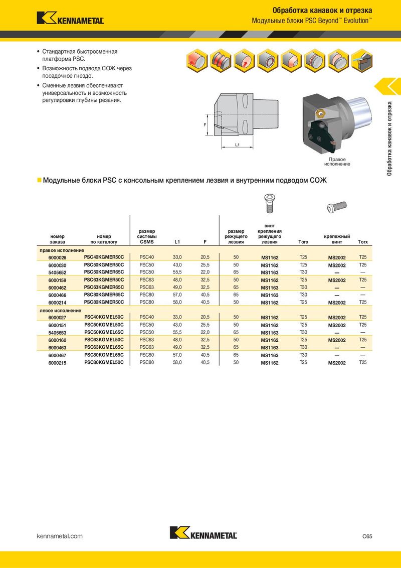 Обработка канавок и отрезка Модульные блоки PSC Beyond™ Evolution™ • Стандартная быстросменная платформа PSC. • Возможность подвода СОЖ через посадочное гнездо. • Сменные лезвия обеспечивают универсальность и возможность регулировки глубины резания. Обработка канавок и отрезка Правое исполнение Модульные блоки PSC с консольным креплением лезвия и внутренним подводом СОЖ винт размер размер крепления номер номер системы режущего режущего крепежный заказа по каталогу CSMS L1 F лезвия лезвия Torx винт Torx правое исполнение 6000026 PSC40KGMER50C PSC40 33,0 20,5 50 MS1162 T25 MS2002 T25 6000030 PSC50KGMER50C PSC50 43,0 25,5 50 MS1162 T25 MS2002 T25 5405652 PSC50KGMER65C PSC50 55,5 22,0 65 MS1163 T30 — — 6000159 PSC63KGMER50C PSC63 48,0 32,5 50 MS1162 T25 MS2002 T25 6000462 PSC63KGMER65C PSC63 49,0 32,5 65 MS1163 T30 — — 6000466 PSC80KGMER65C PSC80 57,0 40,5 65 MS1163 T30 — — 6000214 PSC80KGMER50C PSC80 58,0 40,5 50 MS1162 T25 MS2002 T25 левое исполнение 6000027 PSC40KGMEL50C PSC40 33,0 20,5 50 MS1162 T25 MS2002 T25 6000151 PSC50KGMEL50C PSC50 43,0 25,5 50 MS1162 T25 MS2002 T25 5405653 PSC50KGMEL65C PSC50 55,5 22,0 65 MS1163 T30 — — 6000160 PSC63KGMEL50C PSC63 48,0 32,5 50 MS1162 T25 MS2002 T25 6000463 PSC63KGMEL65C PSC63 49,0 32,5 65 MS1163 T30 — — 6000467 PSC80KGMEL65C PSC80 57,0 40,5 65 MS1163 T30 — — 6000215 PSC80KGMEL50C PSC80 58,0 40,5 50 MS1162 T25 MS2002 T25 kennametal.com C65