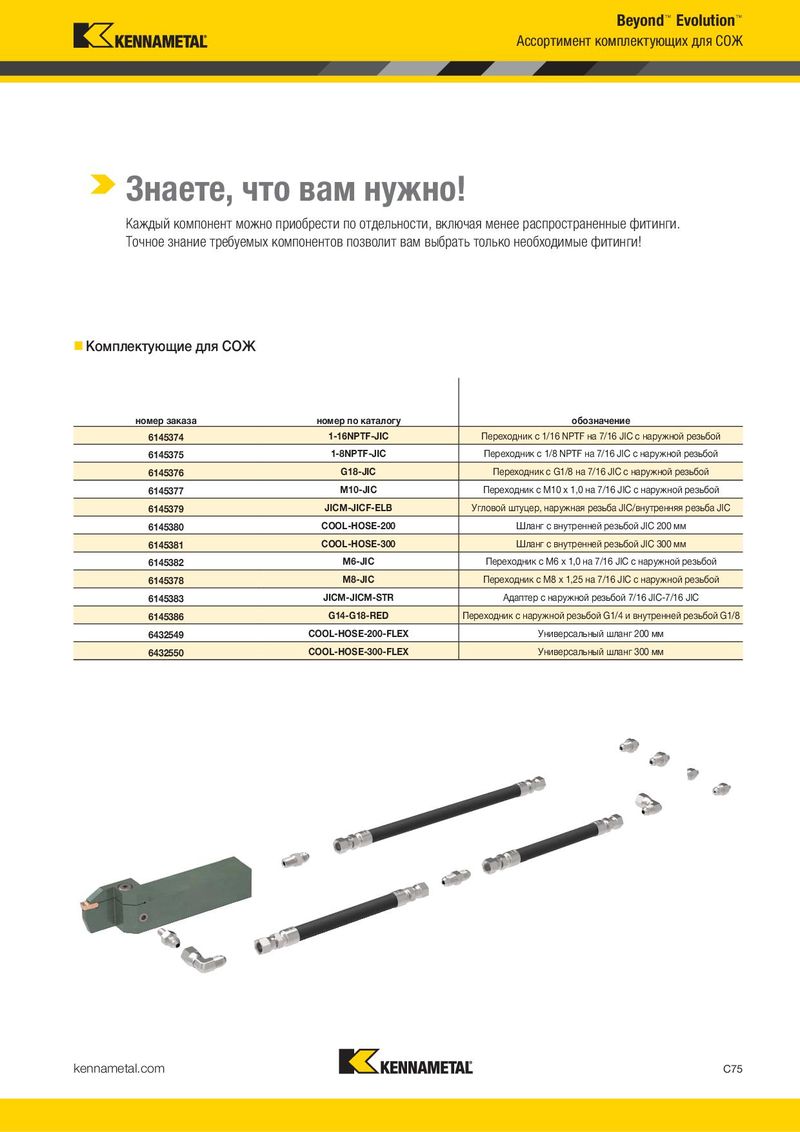 Beyond™ Evolution™ Ассортимент комплектующих для СОЖ Знаете, что вам нужно! Каждый компонент можно приобрести по отдельности, включая менее распространенные фитинги. Точное знание требуемых компонентов позволит вам выбрать только необходимые фитинги! Комплектующие для СОЖ номер заказа номер по каталогу обозначение 6145374 1-16NPTF-JIC Переходник с 1/16 NPTF на 7/16 JIC с наружной резьбой 6145375 1-8NPTF-JIC Переходник с 1/8 NPTF на 7/16 JIC с наружной резьбой 6145376 G18-JIC Переходник с G1/8 на 7/16 JIC с наружной резьбой 6145377 M10-JIC Переходник с M10 x 1,0 на 7/16 JIC с наружной резьбой 6145379 JICM-JICF-ELB Угловой штуцер, наружная резьба JIC/внутренняя резьба JIC 6145380 COOL-HOSE-200 Шланг с внутренней резьбой JIC 200 мм 6145381 COOL-HOSE-300 Шланг с внутренней резьбой JIC 300 мм 6145382 M6-JIC Переходник с M6 x 1,0 на 7/16 JIC с наружной резьбой 6145378 M8-JIC Переходник с M8 x 1,25 на 7/16 JIC с наружной резьбой 6145383 JICM-JICM-STR Адаптер с наружной резьбой 7/16 JIC-7/16 JIC 6145386 G14-G18-RED Переходник с наружной резьбой G1/4 и внутренней резьбой G1/8 6432549 COOL-HOSE-200-FLEX Универсальный шланг 200 мм 6432550 COOL-HOSE-300-FLEX Универсальный шланг 300 мм kennametal.com C75