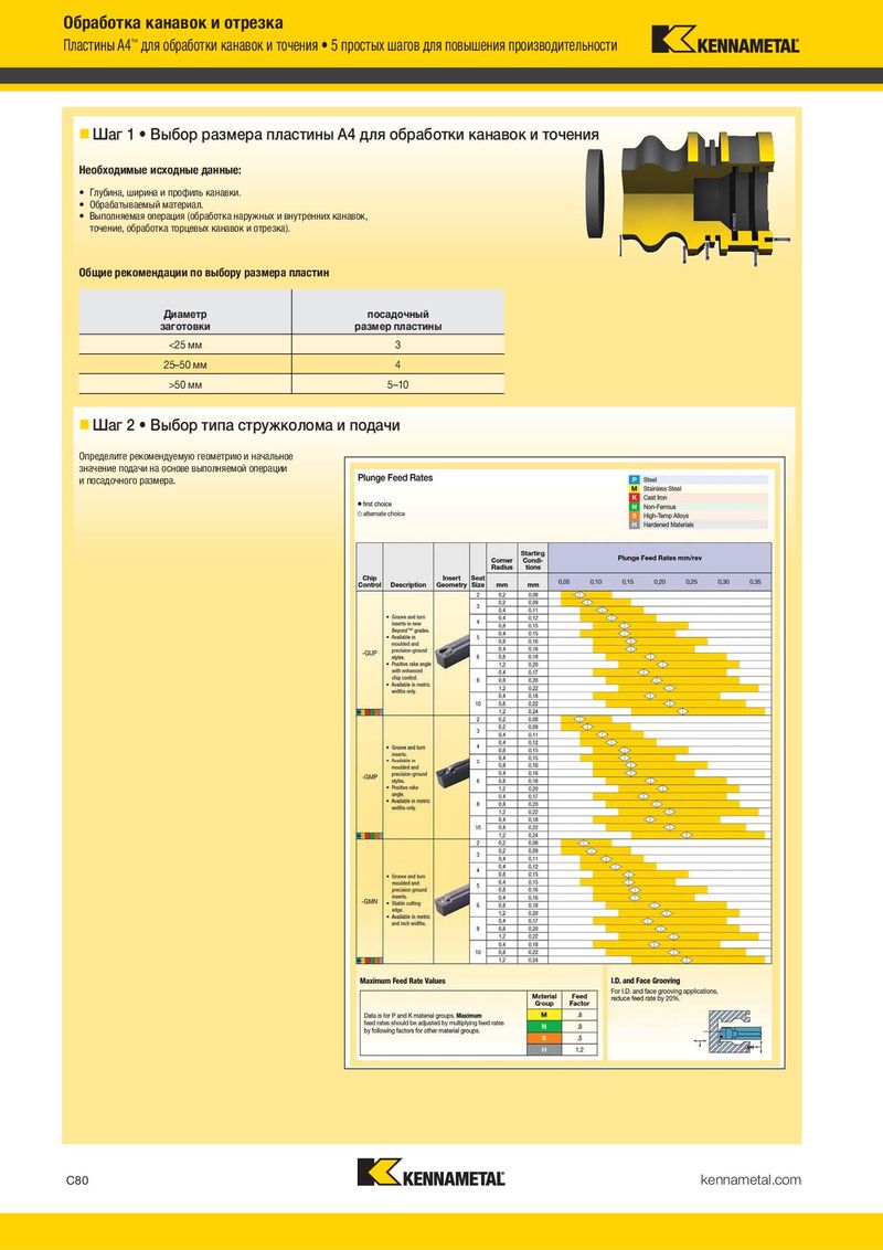 Обработка канавок и отрезка Пластины A4™ для обработки канавок и точения • 5 простых шагов для повышения производительности Шаг 1 • Выбор размера пластины A4 для обработки канавок и точения Необходимые исходные данные: • Глубина, ширина и профиль канавки. • Обрабатываемый материал. • Выполняемая операция (обработка наружных и внутренних канавок, точение, обработка торцевых канавок и отрезка). Общие рекомендации по выбору размера пластин Диаметр посадочный заготовки размер пластины <25 мм 3 25–50 мм 4 >50 мм 5–10 Шаг 2 • Выбор типа стружколома и подачи Определите рекомендуемую геометрию и начальное значение подачи на основе выполняемой операции и посадочного размера. C80 kennametal.com