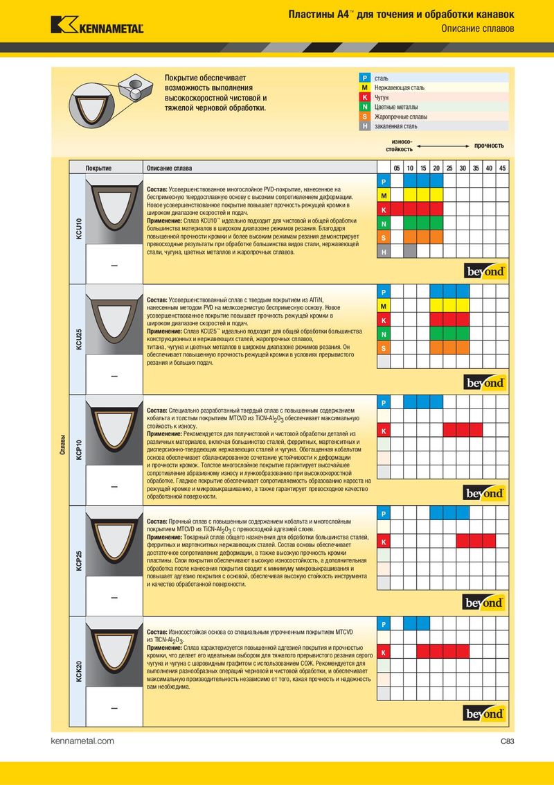 Пластины A4™ для точения и обработки канавок Описание сплавов Покрытие обеспечивает P сталь возможность выполнения M Нержавеющая сталь высокоскоростной чистовой и K Чугун тяжелой черновой обработки. N Цветные металлы S Жаропрочные сплавы H закаленная сталь износо- прочность стойкость Покрытие Описание сплава 05 10 15 20 25 30 35 40 45 P Состав: Усовершенствованное многослойное PVD-покрытие, нанесенное на беспримесную твердосплавную основу с высоким сопротивлением деформации. M Новое усовершенствованное покрытие повышает прочность режущей кромки в K широком диапазоне скоростей и подач. KCU10 Применение: Сплав KCU10™ идеально подходит для чистовой и общей обработки N большинства материалов в широком диапазоне режимов резания. Благодаря повышенной прочности кромки и более высоким режимам резания демонстрирует S превосходные результаты при обработке большинства видов стали, нержавеющей стали, чугуна, цветных металлов и жаропрочных сплавов. H — P Состав: Усовершенствованный сплав с твердым покрытием из AlTiN, нанесенным методом PVD на мелкозернистую беспримесную основу. Новое M усовершенствованное покрытие повышает прочность режущей кромки в K широком диапазоне скоростей и подач. KCU25 Применение: Сплав KCU25™ идеально подходит для общей обработки большинства N конструкционных и нержавеющих сталей, жаропрочных сплавов, титана, чугуна и цветных металлов в широком диапазоне режимов резания. Он S обеспечивает повышенную прочность режущей кромки в условиях прерывистого резания и больших подач. — P Состав: Специально разработанный твердый сплав с повышенным содержанием кобальта и толстым покрытием MTCVD из TiCN-Al2O3 обеспечивает максимальную стойкость к износу. K Сплавы Применение: Рекомендуется для получистовой и чистовой обработки деталей из KCP10 различных материалов, включая большинство сталей, ферритных, мартенситных и дисперсионно-твердеющих нержавеющих сталей и чугуна. Обогащенная кобальтом основа обеспечивает сбалансированное сочетание устойчивости к деформации и прочности кромок. Толстое многослойное покрытие гарантирует высочайшее сопротивление абразивному износу и лункообразованию при высокоскоростной — обработке. Гладкое покрытие обеспечивает сопротивляемость образованию нароста на режущей кромке и микровыкрашиванию, а также гарантирует превосходное качество обработанной поверхности. P Состав: Прочный сплав с повышенным содержанием кобальта и многослойным покрытием MTCVD из TiCN-Al2O3 с превосходной адгезией слоев. Применение: Токарный сплав общего назначения для обработки большинства сталей, K ферритных и мартенситных нержавеющих сталей. Состав основы обеспечивает KCP25 достаточное сопротивление деформации, а также высокую прочность кромки пластины. Слои покрытия обеспечивают высокую износостойкость, а дополнительная обработка после нанесения покрытия сводит к минимуму микровыкрашивания и повышает адгезию покрытия с основой, обеспечивая высокую стойкость инструмента и качество обработанной поверхности. — P Состав: Износостойкая основа со специальным упрочненным покрытием MTCVD из TICN-Al2O3. Применение: Сплав характеризуется повышенной адгезией покрытия и прочностью K кромки, что делает его идеальным выбором для тяжелого прерывистого резания серого KCK20 чугуна и чугуна с шаровидным графитом с использованием СОЖ. Рекомендуется д