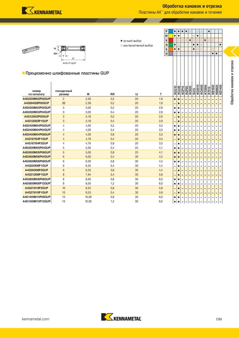 Обработка канавок и отрезка Пластины A4™ для обработки канавок и точения P ⅷ ⅷ ⅷ ⅷ ࠗ ࠗ ࠗ ⅷ M ⅷ ⅷ ࠗ ⅷ ࠗ ⅷ лучший выбор K ࠗ ࠗ ࠗ ࠗ ⅷ ࠗ ࠗ ࠗ ⅷ ࠗ ࠗ ࠗ альтернативный выбор N ⅷ ࠗ ⅷ ⅷ ࠗ ⅷ S ⅷ ⅷ ⅷ ࠗ ࠗ ࠗ H ࠗ ࠗ ⅷ ⅷ A4G-P-GUP отрезка Прецизионно шлифованные пластины GUP и номер посадочный KCU10 KCU25 KCP10 KCP25 KCK20 K313 KC5010 KC5025 KY3500 KT315 KB1630 KB5625 KD1405 Обработка канавок по каталогу размер W RR LI T A4G0200M02P02GUP 2 2,00 0,2 20 1,9 ⅷ ⅷ – – – – – – – – – – – A4G094I2BP05GUP 2B 2,38 0,2 20 1,9 – ⅷ – – – – – – – – – – – A4G0300M03P02GUP 3 3,00 0,2 20 2,9 ⅷ ⅷ – – – – – – – – – – – A4G0300M03P04GUP 3 3,00 0,4 20 2,9 ⅷ ⅷ – – – – – – – – – – – A4G125I03P05GUP 3 3,18 0,2 20 2,9 – ⅷ – – – – – – – – – – – A4G125I03P1GUP 3 3,18 0,4 20 2,9 – ⅷ – – – – – – – – – – – A4G0400M04P02GUP 4 4,00 0,2 20 3,3 ⅷ ⅷ – – – – – – – – – – – A4G0400M04P04GUP 4 4,00 0,4 20 3,3 ⅷ ⅷ – – – – – – – – – – – A4G0400M04P08GUP 4 4,00 0,8 20 3,3 ⅷ ⅷ – – – – – – – – – – – A4G187I04P1GUP 4 4,76 0,4 20 3,3 – ⅷ – – – – – – – – – – – A4G187I04P2GUP 4 4,76 0,8 20 3,3 – ⅷ – – – – – – – – – – – A4G0500M05P04GUP 5 5,00 0,4 25 4,1 ⅷ ⅷ – – – – – – – – – – – A4G0500M05P08GUP 5 5,00 0,8 25 4,1 ⅷ ⅷ – – – – – – – – – – – A4G0600M06P04GUP 6 6,00 0,4 30 4,5 ⅷ ⅷ – – – – – – – – – – – A4G0600M06P08GUP 6 6,00 0,8 30 4,5 ⅷ ⅷ – – – – – – – – – – – A4G250I06P1GUP 6 6,35 0,4 30 4,4 – ⅷ – – – – – – – – – – – A4G250I06P2GUP 6 6,35 0,8 30 4,4 – ⅷ – – – – – – – – – – – A4G312I08P1GUP 8 7,94 0,4 30 5,9 – ⅷ – – – – – – – – – – – A4G0800M08P08GUP 8 8,00 0,8 30 6,0 ⅷ ⅷ – – – – – – – – – – – A4G0800M08P12GUP 8 8,00 1,2 30 6,0 ⅷ ⅷ – – – – – – – – – – – A4G375I10P2GUP 10 9,52 0,8 30 5,9 – ⅷ – – – – – – – – – – – A4G375I10P1GUP 10 9,53 0,4 30 5,9 – ⅷ – – – – – – – – – – – A4G1000M10P08GUP 10 10,00 0,8 30 6,0 ⅷ ⅷ – – – – – – – – – – – A4G1000M10P12GUP 10 10,00 1,2 30 6,0 ⅷ ⅷ – – – – – – – – – – – kennametal.com C93