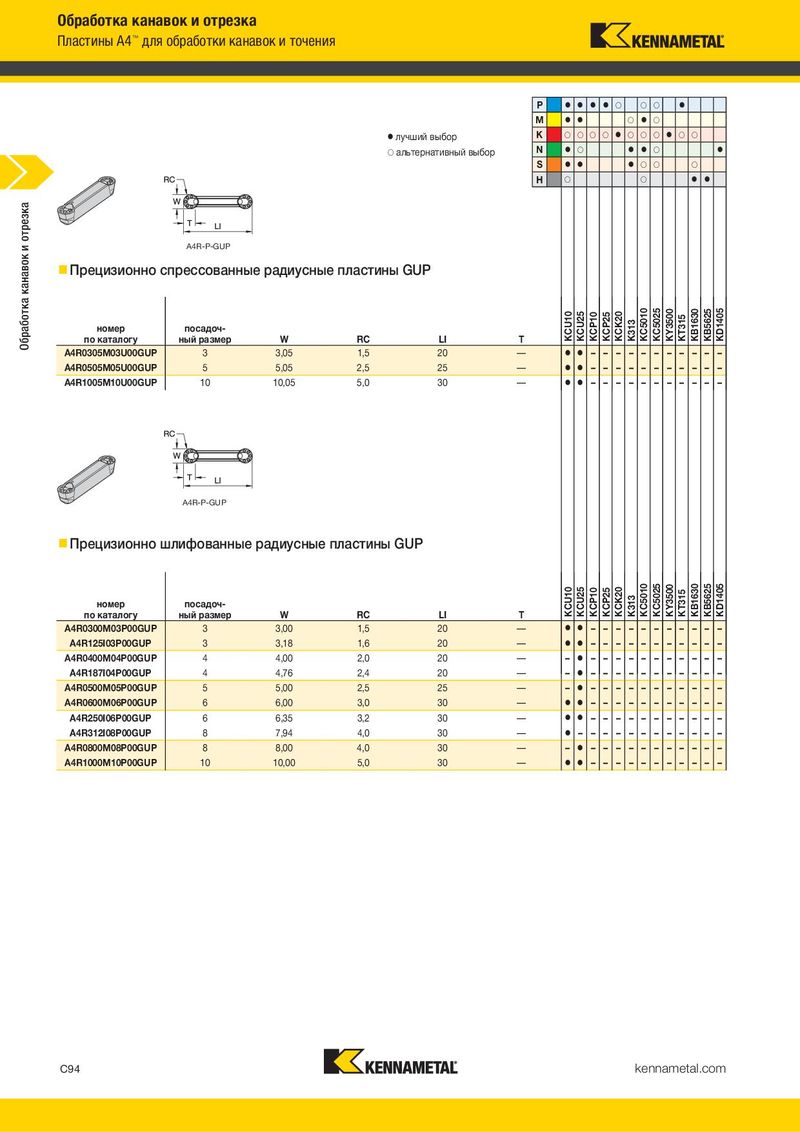 Обработка канавок и отрезка Пластины A4™ для обработки канавок и точения P ⅷ ⅷ ⅷ ⅷ ࠗ ࠗ ࠗ ⅷ M ⅷ ⅷ ࠗ ⅷ ࠗ ⅷ лучший выбор K ࠗ ࠗ ࠗ ࠗ ⅷ ࠗ ࠗ ࠗ ⅷ ࠗ ࠗ ࠗ альтернативный выбор N ⅷ ࠗ ⅷ ⅷ ࠗ ⅷ S ⅷ ⅷ ⅷ ࠗ ࠗ ࠗ H ࠗ ࠗ ⅷ ⅷ отрезка и A4R-P-GUP канавок Прецизионно спрессованные радиусные пластины GUP Обработка номер посадоч- KCU10 KCU25 KCP10 KCP25 KCK20 K313 KC5010 KC5025 KY3500 KT315 KB1630 KB5625 KD1405 по каталогу ный размер W RC LI T A4R0305M03U00GUP 3 3,05 1,5 20 — ⅷ ⅷ – – – – – – – – – – – A4R0505M05U00GUP 5 5,05 2,5 25 — ⅷ ⅷ – – – – – – – – – – – A4R1005M10U00GUP 10 10,05 5,0 30 — ⅷ ⅷ – – – – – – – – – – – A4R-P-GUP Прецизионно шлифованные радиусные пластины GUP номер посадоч- KCU10 KCU25 KCP10 KCP25 KCK20 K313 KC5010 KC5025 KY3500 KT315 KB1630 KB5625 KD1405 по каталогу ный размер W RC LI T A4R0300M03P00GUP 3 3,00 1,5 20 — ⅷ ⅷ – – – – – – – – – – – A4R125I03P00GUP 3 3,18 1,6 20 — ⅷ ⅷ – – – – – – – – – – – A4R0400M04P00GUP 4 4,00 2,0 20 — – ⅷ – – – – – – – – – – – A4R187I04P00GUP 4 4,76 2,4 20 — – ⅷ – – – – – – – – – – – A4R0500M05P00GUP 5 5,00 2,5 25 — – ⅷ – – – – – – – – – – – A4R0600M06P00GUP 6 6,00 3,0 30 — ⅷ ⅷ – – – – – – – – – – – A4R250I06P00GUP 6 6,35 3,2 30 — ⅷ ⅷ – – – – – – – – – – – A4R312I08P00GUP 8 7,94 4,0 30 — ⅷ – – – – – – – – – – – – A4R0800M08P00GUP 8 8,00 4,0 30 — – ⅷ – – – – – – – – – – – A4R1000M10P00GUP 10 10,00 5,0 30 — ⅷ ⅷ – – – – – – – – – – – C94 kennametal.com