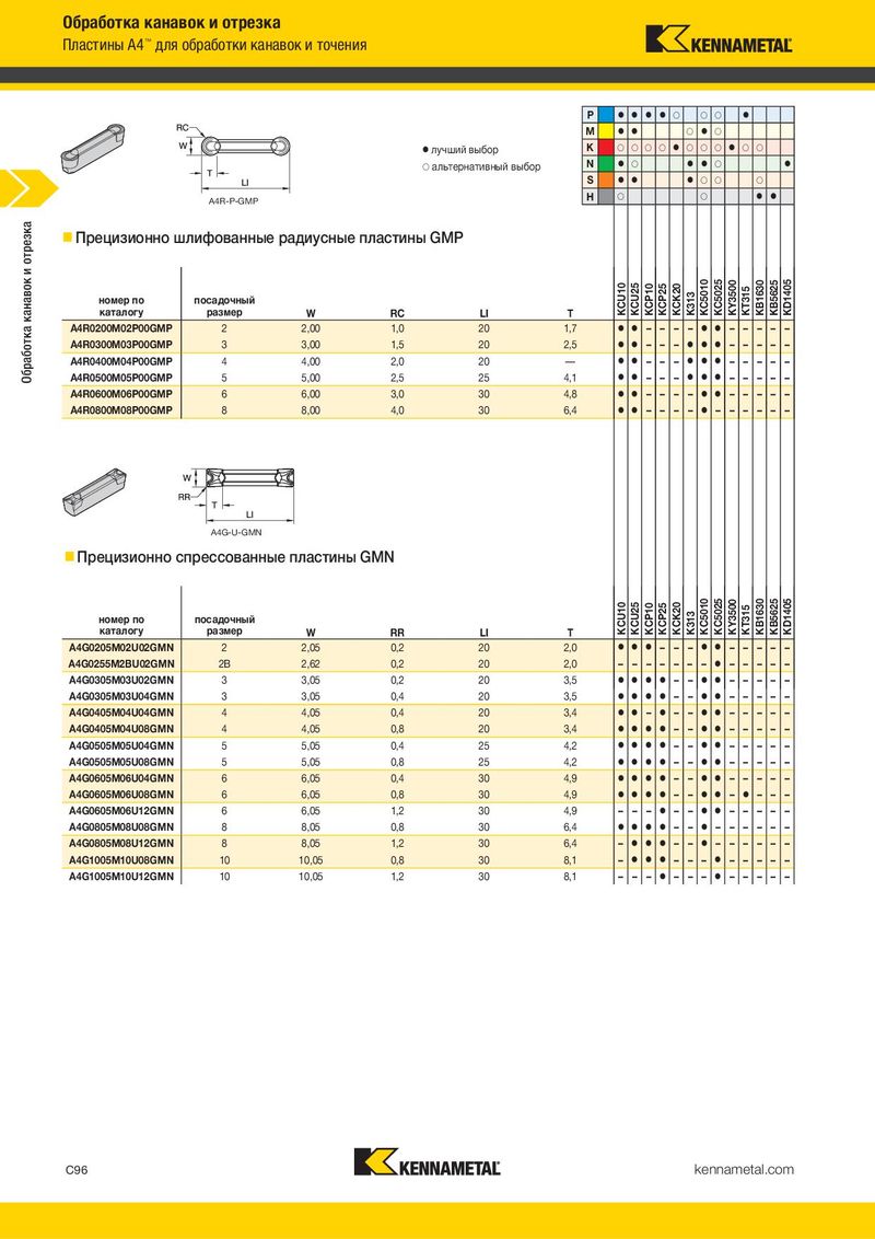 Обработка канавок и отрезка Пластины A4™ для обработки канавок и точения P ⅷ ⅷ ⅷ ⅷ ࠗ ࠗ ࠗ ⅷ M ⅷ ⅷ ࠗ ⅷ ࠗ ⅷ лучший выбор K ࠗ ࠗ ࠗ ࠗ ⅷ ࠗ ࠗ ࠗ ⅷ ࠗ ࠗ ࠗ альтернативный выбор N ⅷ ࠗ ⅷ ⅷ ࠗ ⅷ S ⅷ ⅷ ⅷ ࠗ ࠗ ࠗ A4R-P-GMP H ࠗ ࠗ ⅷ ⅷ отрезка Прецизионно шлифованные радиусные пластины GMP и канавок номер по посадочный KCU10 KCU25 KCP10 KCP25 KCK20 K313 KC5010 KC5025 KY3500 KT315 KB1630 KB5625 KD1405 каталогу размер W RC LI T Обработка A4R0200M02P00GMP 2 2,00 1,0 20 1,7 ⅷ ⅷ – – – – ⅷ ⅷ – – – – – A4R0300M03P00GMP 3 3,00 1,5 20 2,5 ⅷ ⅷ – – – ⅷ ⅷ ⅷ – – – – – A4R0400M04P00GMP 4 4,00 2,0 20 — ⅷ ⅷ – – – ⅷ ⅷ ⅷ – – – – – A4R0500M05P00GMP 5 5,00 2,5 25 4,1 ⅷ ⅷ – – – ⅷ ⅷ ⅷ – – – – – A4R0600M06P00GMP 6 6,00 3,0 30 4,8 ⅷ ⅷ – – – – ⅷ ⅷ – – – – – A4R0800M08P00GMP 8 8,00 4,0 30 6,4 ⅷ ⅷ – – – – ⅷ – – – – – – A4G-U-GMN Прецизионно спрессованные пластины GMN номер по посадочный KCU10 KCU25 KCP10 KCP25 KCK20 K313 KC5010 KC5025 KY3500 KT315 KB1630 KB5625 KD1405 каталогу размер W RR LI T A4G0205M02U02GMN 2 2,05 0,2 20 2,0 ⅷ ⅷ ⅷ – – – ⅷ ⅷ – – – – – A4G0255M2BU02GMN 2B 2,62 0,2 20 2,0 – – – – – – – ⅷ – – – – – A4G0305M03U02GMN 3 3,05 0,2 20 3,5 ⅷ ⅷ ⅷ ⅷ – – ⅷ ⅷ – – – – – A4G0305M03U04GMN 3 3,05 0,4 20 3,5 ⅷ ⅷ ⅷ ⅷ – – ⅷ ⅷ – – – – – A4G0405M04U04GMN 4 4,05 0,4 20 3,4 ⅷ ⅷ – ⅷ – – ⅷ ⅷ – – – – – A4G0405M04U08GMN 4 4,05 0,8 20 3,4 ⅷ ⅷ ⅷ ⅷ – – ⅷ ⅷ – – – – – A4G0505M05U04GMN 5 5,05 0,4 25 4,2 ⅷ ⅷ ⅷ ⅷ – – ⅷ ⅷ – – – – – A4G0505M05U08GMN 5 5,05 0,8 25 4,2 ⅷ ⅷ ⅷ ⅷ – – ⅷ ⅷ – – – – – A4G0605M06U04GMN 6 6,05 0,4 30 4,9 ⅷ ⅷ ⅷ ⅷ – – ⅷ ⅷ – – – – – A4G0605M06U08GMN 6 6,05 0,8 30 4,9 ⅷ ⅷ ⅷ ⅷ – – ⅷ ⅷ – ⅷ – – – A4G0605M06U12GMN 6 6,05 1,2 30 4,9 – – – ⅷ – – ⅷ ⅷ – – – – – A4G0805M08U08GMN 8 8,05 0,8 30 6,4 ⅷ ⅷ ⅷ ⅷ – – ⅷ – – – – – – A4G0805M08U12GMN 8 8,05 1,2 30 6,4 – ⅷ ⅷ ⅷ – – ⅷ – – – – – – A4G1005M10U08GMN 10 10,05 0,8 30 8,1 – ⅷ ⅷ ⅷ – – – ⅷ – – – – – A4G1005M10U12GMN 10 10,05 1,2 30 8,1 – – – ⅷ – – – ⅷ – – – – – C96 kennametal.com