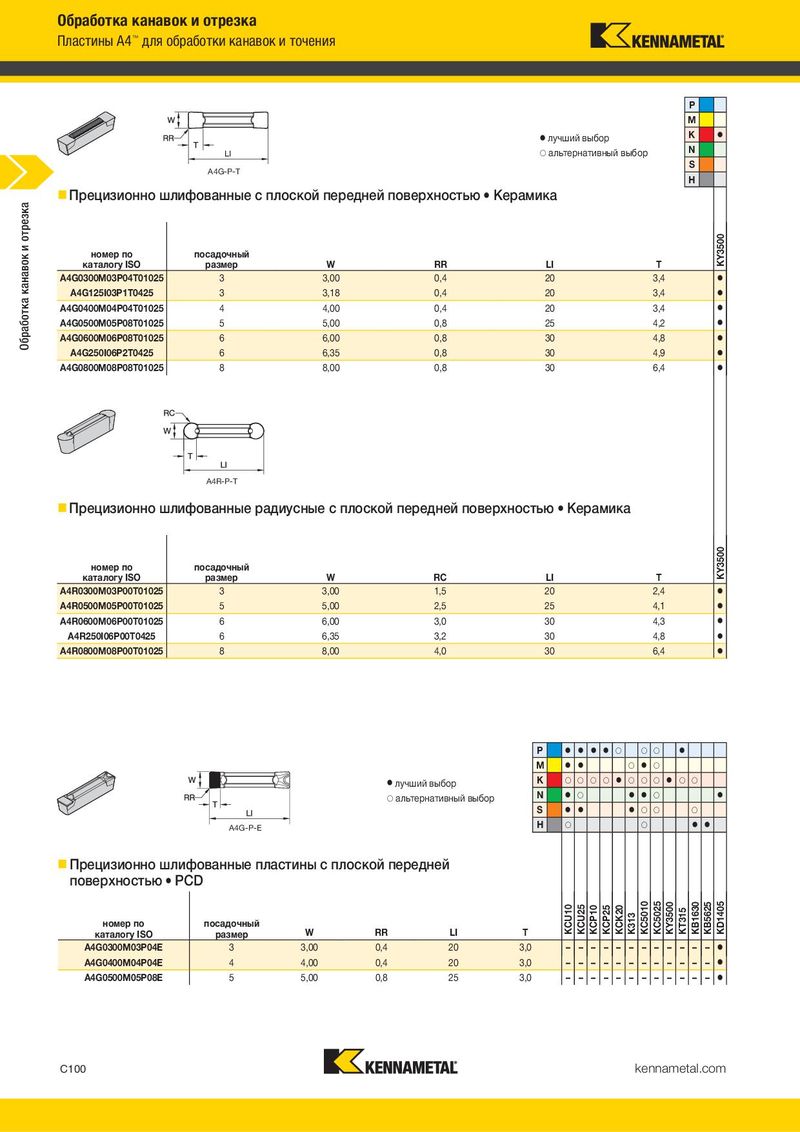 Обработка канавок и отрезка Пластины A4™ для обработки канавок и точения P M ⅷ лучший выбор K ⅷ ࠗ альтернативный выбор N A4G-P-T S H Прецизионно шлифованные с плоской передней поверхностью ⅷ Керамика канавок и отрезка номер по посадочный KY3500 каталогу ISO размер W RR LI T A4G0300M03P04T01025 3 3,00 0,4 20 3,4 ⅷ A4G125I03P1T0425 3 3,18 0,4 20 3,4 ⅷ Обработка A4G0400M04P04T01025 4 4,00 0,4 20 3,4 ⅷ A4G0500M05P08T01025 5 5,00 0,8 25 4,2 ⅷ A4G0600M06P08T01025 6 6,00 0,8 30 4,8 ⅷ A4G250I06P2T0425 6 6,35 0,8 30 4,9 ⅷ A4G0800M08P08T01025 8 8,00 0,8 30 6,4 ⅷ A4R-P-T Прецизионно шлифованные радиусные с плоской передней поверхностью ⅷ Керамика номер по посадочный KY3500 каталогу ISO размер W RC LI T A4R0300M03P00T01025 3 3,00 1,5 20 2,4 ⅷ A4R0500M05P00T01025 5 5,00 2,5 25 4,1 ⅷ A4R0600M06P00T01025 6 6,00 3,0 30 4,3 ⅷ A4R250I06P00T0425 6 6,35 3,2 30 4,8 ⅷ A4R0800M08P00T01025 8 8,00 4,0 30 6,4 ⅷ P ⅷ ⅷ ⅷ ⅷ ࠗ ࠗ ࠗ ⅷ M ⅷ ⅷ ࠗ ⅷ ࠗ ⅷ лучший выбор K ࠗ ࠗ ࠗ ࠗ ⅷ ࠗ ࠗ ࠗ ⅷ ࠗ ࠗ ࠗ альтернативный выбор N ⅷ ࠗ ⅷ ⅷ ࠗ ⅷ S ⅷ ⅷ ⅷ ࠗ ࠗ ࠗ A4G-P-E H ࠗ ࠗ ⅷ ⅷ Прецизионно шлифованные пластины с плоской передней поверхностью ⅷ PCD номер по посадочный KCU10 KCU25 KCP10 KCP25 KCK20 K313 KC5010 KC5025 KY3500 KT315 KB1630 KB5625 KD1405 каталогу ISO размер W RR LI T A4G0300M03P04E 3 3,00 0,4 20 3,0 – – – – – – – – – – – – ⅷ A4G0400M04P04E 4 4,00 0,4 20 3,0 – – – – – – – – – – – – ⅷ A4G0500M05P08E 5 5,00 0,8 25 3,0 – – – – – – – – – – – – ⅷ C100 kennametal.com