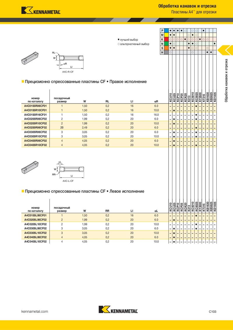 Обработка канавок и отрезка Пластины A4™ для отрезки P ⅷ ⅷ ⅷ ⅷ ࠗ ࠗ ࠗ ⅷ M ⅷ ⅷ ࠗ ⅷ ࠗ ⅷ лучший выбор K ࠗ ࠗ ࠗ ࠗ ⅷ ࠗ ࠗ ࠗ ⅷ ࠗ ࠗ ࠗ альтернативный выбор N ⅷ ࠗ ⅷ ⅷ ࠗ ⅷ S ⅷ ⅷ ⅷ ࠗ ࠗ ࠗ H ࠗ ࠗ ⅷ ⅷ отрезка A4C-R-CF и Прецизионно спрессованные пластины CF • Правое исполнение канавок номер посадочный KCU10 KCU25 KCP10 KCP25 KCK20 K313 KC5010 KC5025 KY3500 KT315 KB1630 KB5625 KD1405 Обработка по каталогу размер W RL LI _R A4C0155R06CF01 1 1,50 0,2 16 6.0 – – – – – – – ⅷ – – – – – A4C0155R10CF01 1 1,50 0,2 16 10.0 – ⅷ – – – – – – – – – – – A4C0155R16CF01 1 1,50 0,2 16 16.0 – – – – – – – ⅷ – – – – – A4C0205R06CF02 2 1,99 0,2 20 6.0 – ⅷ – – – – – ⅷ – – – – – A4C0205R10CF02 2 1,99 0,2 20 10.0 – ⅷ – – – – – – – – – – – A4C0255R06CF02 2B 2,49 0,2 20 6.0 – – – – – – – ⅷ – – – – – A4C0305R06CF02 3 3,05 0,2 20 6.0 – ⅷ – – – – – ⅷ – – – – – A4C0305R10CF02 3 3,05 0,2 20 10.0 – ⅷ – – – – – ⅷ – – – – – A4C0405R06CF02 4 4,05 0,2 20 6.0 – ⅷ – – – – – – – – – – – A4C0405R10CF02 4 4,05 0,2 20 10.0 – ⅷ – – – – – ⅷ – – – – – A4C-L-CF Прецизионно спрессованные пластины CF • Левое исполнение номер посадочный KCU10 KCU25 KCP10 KCP25 KCK20 K313 KC5010 KC5025 KY3500 KT315 KB1630 KB5625 KD1405 по каталогу размер W RR LI _L A4C0155L06CF01 1 1,50 0,2 16 6.0 – – – – – – – ⅷ – – – – – A4C0205L06CF02 2 1,99 0,2 20 6.0 – ⅷ – – – – – – – – – – – A4C0205L10CF02 2 1,99 0,2 20 10.0 – – – – – – – ⅷ – – – – – A4C0305L06CF02 3 3,05 0,2 20 6.0 – ⅷ – – – – – ⅷ – – – – – A4C0305L10CF02 3 3,05 0,2 20 10.0 – ⅷ – – – – – – – – – – – A4C0405L06CF02 4 4,05 0,2 20 6.0 – ⅷ – – – – – – – – – – – A4C0405L10CF02 4 4,05 0,2 20 10.0 – ⅷ – – – – – – – – – – – kennametal.com C103