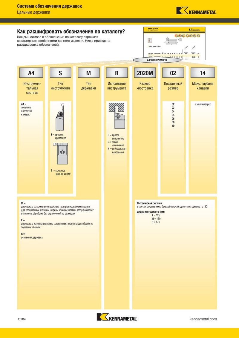 Система обозначения державок Цельные державки Как расшифровать обозначение по каталогу? Каждый символ в обозначении по каталогу отражает характерные особенности данного изделия. Ниже приведена расшифровка обозначений. A4SMR2020M0214 A4 S M R 2020M 02 14 Инструмен- Тип Тип Исполнение Размер Посадочный Макс. глубина тальная инструмента державки инструмента хвостовика размер канавки система A4 = 02 в миллиметрах точение и 03 обработка 04 канавок 05 06 08 10 S = прямое R = правое крепление исполнение L = левое исполнение N = нейтральное исполнение E = концевое крепление 90º M= Метрическая система: державка с максимально надежным позиционированием пластин высота x ширина в мм, буква обозначает длину инструмента по ISO для специальных значений ширины канавки; прямой зазор позволяет длина инструмента (мм) выполнять обработку без ограничений по размерам K = 125 E= M = 150 державка с консольным типом закрепления пластины для обработки P = 170 торцевых канавок C= усиленная державка C104 kennametal.com