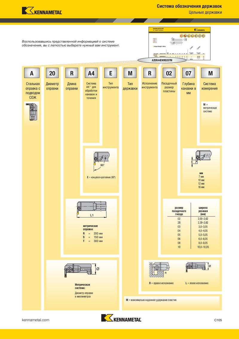 Система обозначения державок Цельные державки Воспользовавшись представленной информацией о системе обозначения, вы с легкостью выберете нужный вам инструмент. A20RA4EMR0207M A 20 R A4 E M R 02 07 M Стальная Диаметр Длина Система Тип Тип Исполнение Посадочный Глубина Система оправка с оправки оправки A4™ для инструмента державки инструмента размер канавки в измерения подводом обработки пластины мм канавок и СОЖ точения M= метрическая система мм E = концевое крепление (90º) 7 мм 10 мм 12 мм 16 мм размер ширина посадочного резания гнезда (мм) 02 2,00–2,62 2B 2,39–2,62 метрические 03 3,0–3,05 оправки: 04 4,0–4,05 R = 200 мм 05 5,0–5,05 S = 150 мм 06 6,0–6,05 T = 300 мм 08 8,0–8,05 10 10,0–10,05 Метрическая R = правое исполнение L = левое исполнение система: Диаметр оправки в миллиметрах M = максимально надежное удержание пластин kennametal.com C105