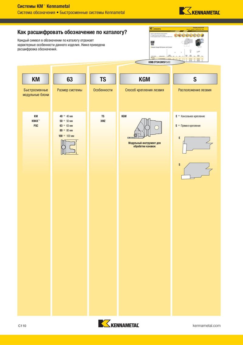 Системы KM™ Kennametal Система обозначения • Быстросменные системы Kennametal Как расшифровать обозначение по каталогу? Каждый символ в обозначении по каталогу отражает характерные особенности данного изделия. Ниже приведена расшифровка обозначений. KM63TSKGMSR50C KM 63 TS KGM S Быстросменные Размер системы Особенности Способ крепления лезвия Расположение лезвия модульные блоки KM 40 = 40 мм TS KGM E = Консольное крепление KM4X™ 50 = 50 мм XMZ PSC 63 = 63 мм S = Прямое крепление 80 = 80 мм 100 = 100 мм E Модульный инструмент для обработки канавок S C110 kennametal.com