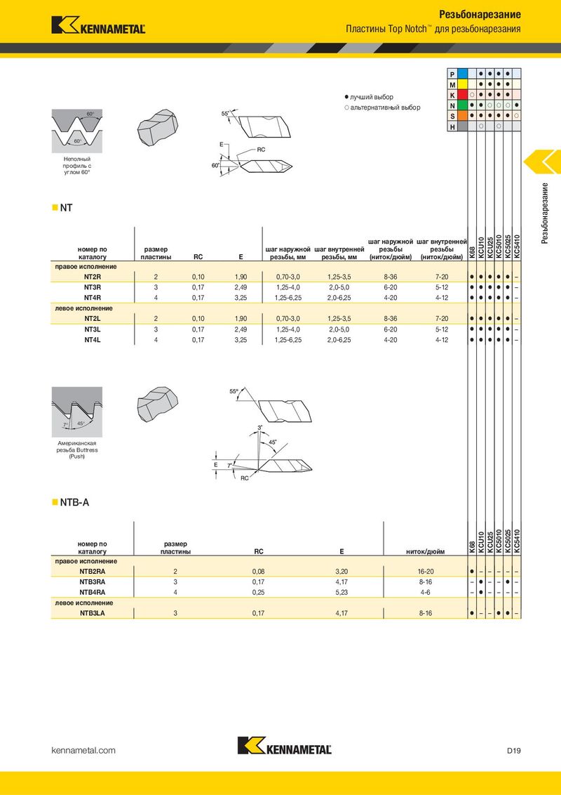 Резьбонарезание Пластины Top Notch™ для резьбонарезания P ⅷ ⅷ ⅷ ⅷ M ⅷ ⅷ ⅷ ⅷ ⅷ лучший выбор K ࠗ ⅷ ⅷ ⅷ ⅷ ࠗ альтернативный выбор N ⅷ ⅷ ࠗ ࠗ ࠗ ⅷ 60° S ⅷ ⅷ ⅷ ⅷ ⅷ ࠗ H ࠗ ࠗ 60° Неполный профиль с углом 60° NT Резьбонарезание шаг наружной шаг внутренней KCU10 KCU25 KC5010 KC5025 KC5410 номер по размер шаг наружной шаг внутренней резьбы резьбы K68 каталогу пластины RC E резьбы, мм резьбы, мм (ниток/дюйм) (ниток/дюйм) правое исполнение NT2R 2 0,10 1,90 0,70-3,0 1,25-3,5 8-36 7-20 ⅷ ⅷ ⅷ ⅷ ⅷ – NT3R 3 0,17 2,49 1,25-4,0 2,0-5,0 6-20 5-12 ⅷ ⅷ ⅷ ⅷ ⅷ – NT4R 4 0,17 3,25 1,25-6,25 2,0-6,25 4-20 4-12 ⅷ ⅷ ⅷ ⅷ ⅷ – левое исполнение NT2L 2 0,10 1,90 0,70-3,0 1,25-3,5 8-36 7-20 ⅷ ⅷ ⅷ ⅷ ⅷ – NT3L 3 0,17 2,49 1,25-4,0 2,0-5,0 6-20 5-12 ⅷ ⅷ ⅷ ⅷ ⅷ – NT4L 4 0,17 3,25 1,25-6,25 2,0-6,25 4-20 4-12 ⅷ ⅷ ⅷ ⅷ ⅷ – 7° 45° Американская резьба Buttress (Push) NTB-A номер по размер K68 KCU10 KCU25 KC5010 KC5025 KC5410 каталогу пластины RC E ниток/дюйм правое исполнение NTB2RA 2 0,08 3,20 16-20 ⅷ – – – – – NTB3RA 3 0,17 4,17 8-16 – ⅷ – – ⅷ – NTB4RA 4 0,25 5,23 4-6 – ⅷ – – – – левое исполнение NTB3LA 3 0,17 4,17 8-16 ⅷ – – ⅷ ⅷ – kennametal.com D19