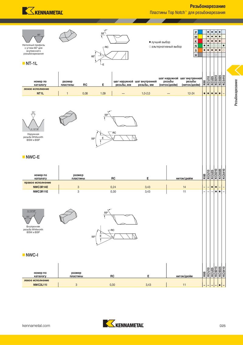 Резьбонарезание Пластины Top Notch™ для резьбонарезания P ⅷ ⅷ ⅷ ⅷ 60° M ⅷ ⅷ ⅷ ⅷ ⅷ лучший выбор K ࠗ ⅷ ⅷ ⅷ ⅷ Неполный профиль ࠗ альтернативный выбор N ⅷ ⅷ ࠗ ࠗ ࠗ ⅷ с углом 60° для ⅷ ⅷ ⅷ ⅷ ⅷ ࠗ внутреннего S резьбонарезания H ࠗ ࠗ NT-1L шаг наружной шаг внутренней KCU10 KCU25 KC5010 KC5025 KC5410 Резьбонарезание номер по размер шаг наружной шаг внутренней резьбы резьбы K68 каталогу пластины RC E резьбы, мм резьбы, мм (ниток/дюйм) (ниток/дюйм) левое исполнение NT1L 1 0,08 1,09 — 1,0-2,0 — 12-24 ⅷ ⅷ ⅷ ⅷ ⅷ – 55° 0,1373P Наружная резьба Whitworth BSW и BSP NWC-E номер по размер K68 KCU10 KCU25 KC5010 KC5025 KC5410 каталогу пластины RC E ниток/дюйм правое исполнение NWC3R14E 3 0,24 3,43 14 – – ⅷ ⅷ – – NWC3R11E 3 0,30 3,43 11 – – – ⅷ ⅷ – 0,1373P 55° Внутренняя резьба Whitworth BSW и BSP NWC-I номер по размер K68 KCU10 KCU25 KC5010 KC5025 KC5410 каталогу пластины RC E ниток/дюйм левое исполнение NWC3L11I 3 0,30 3,43 11 – – – – ⅷ – kennametal.com D25