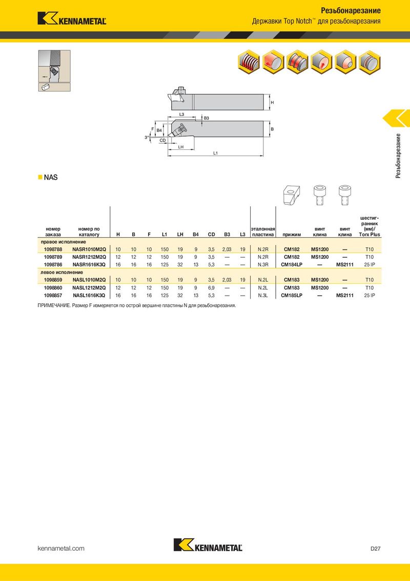 Резьбонарезание Державки Top Notch™ для резьбонарезания LH Резьбонарезание NAS шестиг- ранник номер номер по эталонная винт винт (мм)/ заказа каталогу H B F L1 LH B4 CD B3 L3 пластина прижим клина клина Torx Plus правое исполнение 1098788 NASR1010M2Q 10 10 10 150 19 9 3,5 2,03 19 N.2R CM182 MS1200 — T10 1098789 NASR1212M2Q 12 12 12 150 19 9 3,5 — — N.2R CM182 MS1200 — T10 1098786 NASR1616K3Q 16 16 16 125 32 13 5,3 — — N.3R CM184LP — MS2111 25 IP левое исполнение 1098859 NASL1010M2Q 10 10 10 150 19 9 3,5 2,03 19 N.2L CM183 MS1200 — T10 1098860 NASL1212M2Q 12 12 12 150 19 9 6,9 — — N.2L CM183 MS1200 — T10 1098857 NASL1616K3Q 16 16 16 125 32 13 5,3 — — N.3L CM185LP — MS2111 25 IP ПРИМЕЧАНИЕ. Размер F измеряется по острой вершине пластины N для резьбонарезания. kennametal.com D27