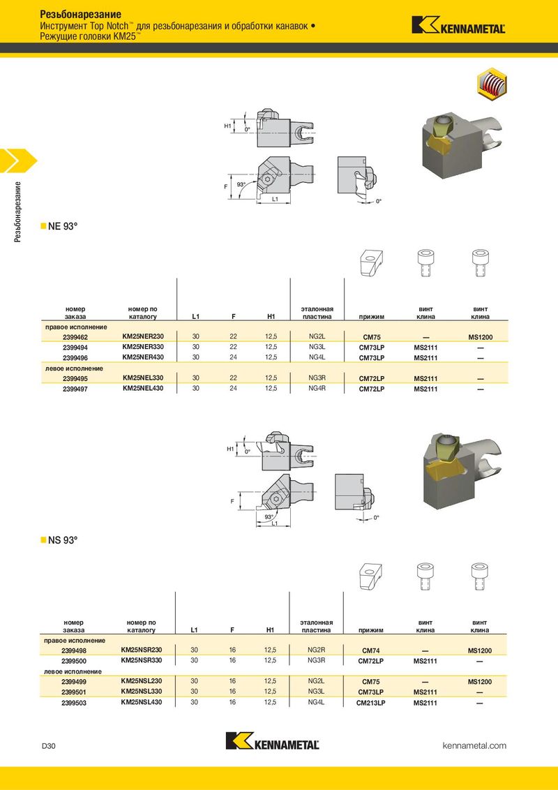 Резьбонарезание Инструмент Top Notch™ для резьбонарезания и обработки канавок • Режущие головки KM25™ Резьбонарезание NE 93° номер номер по эталонная винт винт заказа каталогу L1 F H1 пластина прижим клина клина правое исполнение 2399462 KM25NER230 30 22 12,5 NG2L CM75 — MS1200 2399494 KM25NER330 30 22 12,5 NG3L CM73LP MS2111 — 2399496 KM25NER430 30 24 12,5 NG4L CM73LP MS2111 — левое исполнение 2399495 KM25NEL330 30 22 12,5 NG3R CM72LP MS2111 — 2399497 KM25NEL430 30 24 12,5 NG4R CM72LP MS2111 — NS 93° номер номер по эталонная винт винт заказа каталогу L1 F H1 пластина прижим клина клина правое исполнение 2399498 KM25NSR230 30 16 12,5 NG2R CM74 — MS1200 2399500 KM25NSR330 30 16 12,5 NG3R CM72LP MS2111 — левое исполнение 2399499 KM25NSL230 30 16 12,5 NG2L CM75 — MS1200 2399501 KM25NSL330 30 16 12,5 NG3L CM73LP MS2111 — 2399503 KM25NSL430 30 16 12,5 NG4L CM213LP MS2111 — D30 kennametal.com