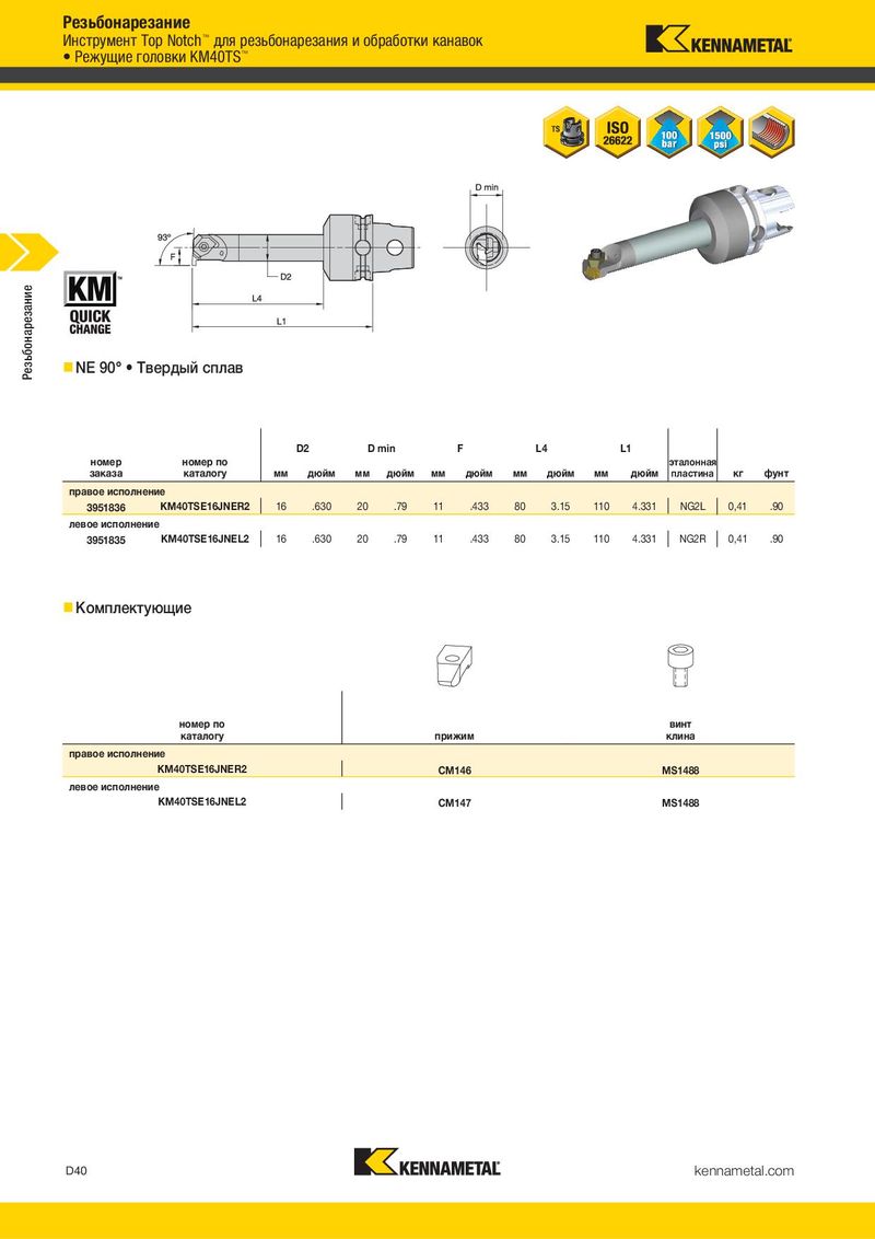 Резьбонарезание Инструмент Top Notch™ для резьбонарезания и обработки канавок • Режущие головки KM40TS™ Резьбонарезание NE 90° • Твердый сплав D2 D min F L4 L1 D2 D min F L4 L1 номер номер по эталонная заказа каталогу мм дюйм мм дюйм мм дюйм мм дюйм мм дюйм пластина кг фунт правое исполнение 3951836 KM40TSE16JNER2 16 .630 20 .79 11 .433 80 3.15 110 4.331 NG2L 0,41 .90 левое исполнение 3951835 KM40TSE16JNEL2 16 .630 20 .79 11 .433 80 3.15 110 4.331 NG2R 0,41 .90 Комплектующие номер по винт каталогу прижим клина правое исполнение KM40TSE16JNER2 CM146 MS1488 левое исполнение KM40TSE16JNEL2 CM147 MS1488 D40 kennametal.com