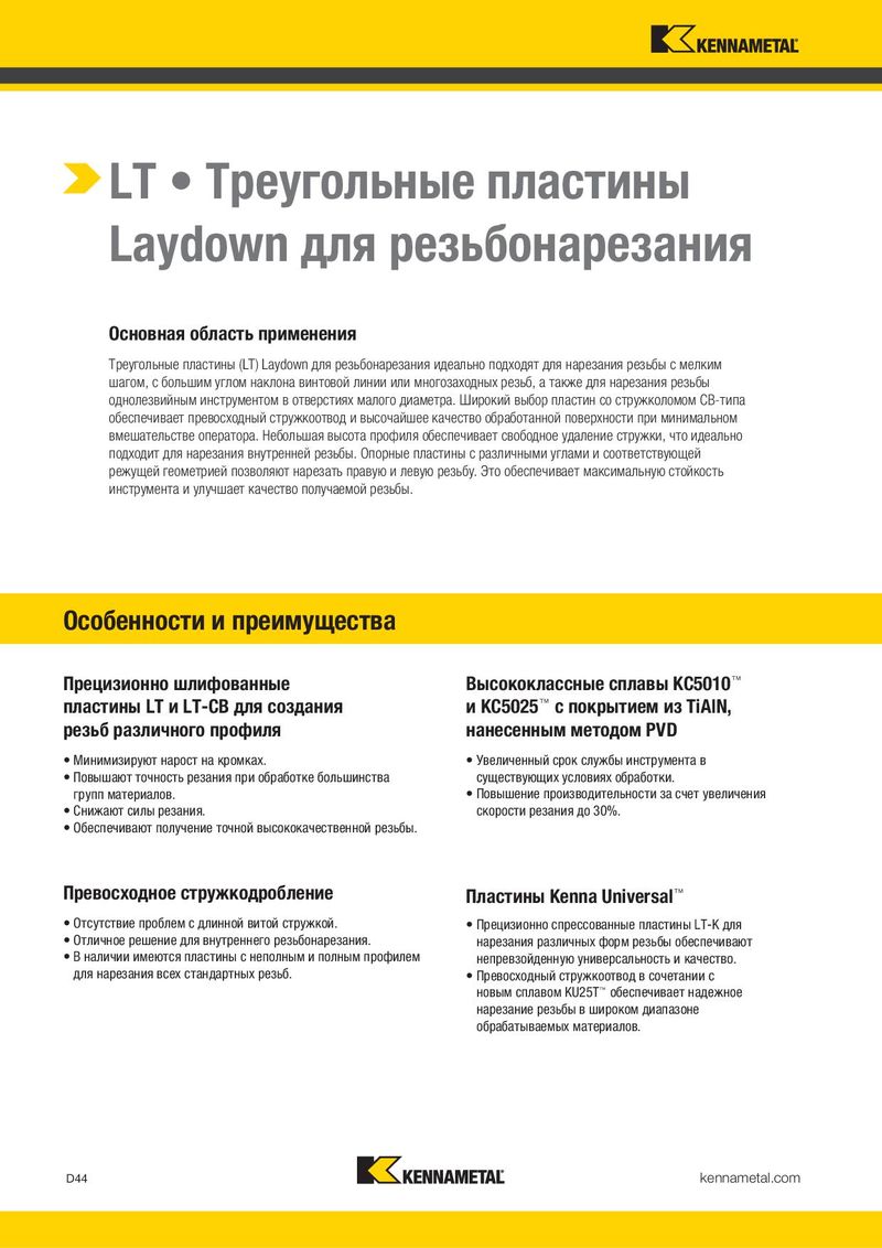 LT • Треугольные пластины Laydown для резьбонарезания Основная область применения Треугольные пластины (LT) Laydown для резьбонарезания идеально подходят для нарезания резьбы с мелким шагом, с большим углом наклона винтовой линии или многозаходных резьб, а также для нарезания резьбы однолезвийным инструментом в отверстиях малого диаметра. Широкий выбор пластин со стружколомом CB-типа обеспечивает превосходный стружкоотвод и высочайшее качество обработанной поверхности при минимальном вмешательстве оператора. Небольшая высота профиля обеспечивает свободное удаление стружки, что идеально подходит для нарезания внутренней резьбы. Опорные пластины с различными углами и соответствующей режущей геометрией позволяют нарезать правую и левую резьбу. Это обеспечивает максимальную стойкость инструмента и улучшает качество получаемой резьбы. Особенности и преимущества Прецизионно шлифованные Высококлассные сплавы KC5010™ пластины LT и LT-CB для создания и KC5025™ с покрытием из TiAlN, резьб различного профиля нанесенным методом PVD • Минимизируют нарост на кромках. • Увеличенный срок службы инструмента в • Повышают точность резания при обработке большинства существующих условиях обработки. групп материалов. • Повышение производительности за счет увеличения • Снижают силы резания. скорости резания до 30%. • Обеспечивают получение точной высококачественной резьбы. Превосходное стружкодробление Пластины Kenna Universal™ • Отсутствие проблем с длинной витой стружкой. • Прецизионно спрессованные пластины LT-K для • Отличное решение для внутреннего резьбонарезания. нарезания различных форм резьбы обеспечивают • В наличии имеются пластины с неполным и полным профилем непревзойденную универсальность и качество. для нарезания всех стандартных резьб. • Превосходный стружкоотвод в сочетании с новым сплавом KU25T™ обеспечивает надежное нарезание резьбы в широком диапазоне обрабатываемых материалов. D44 kennametal.com