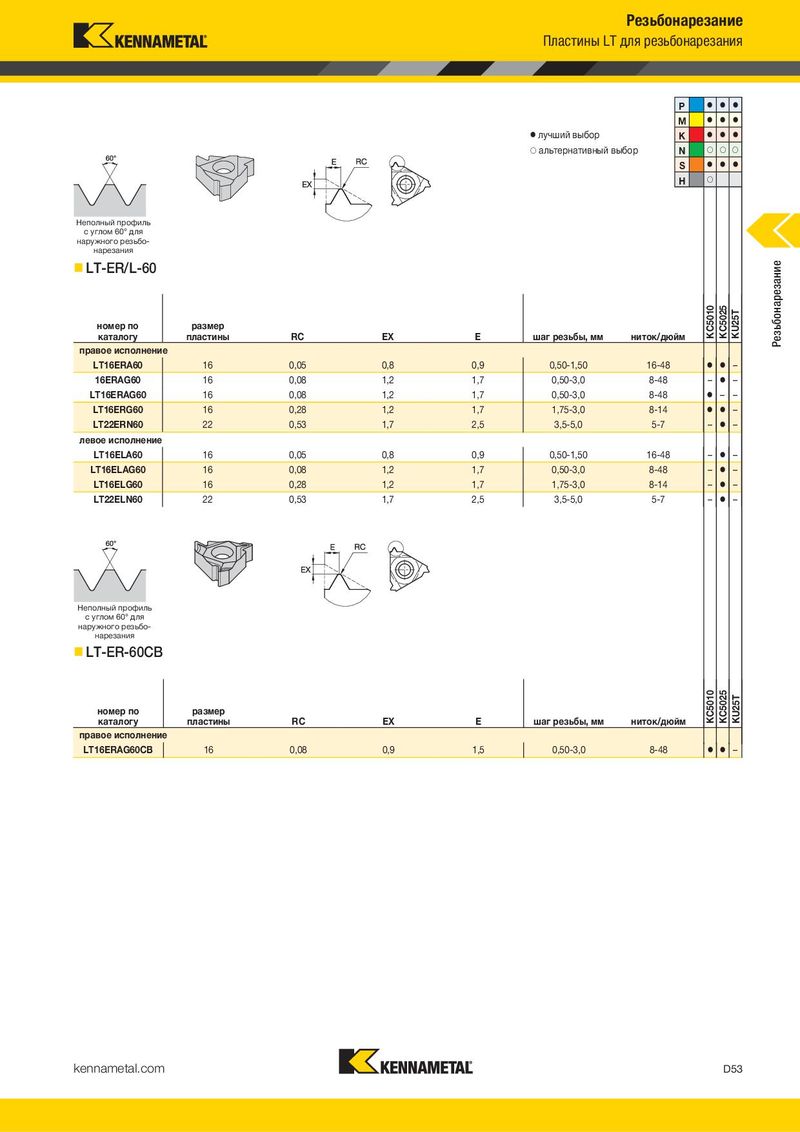 Резьбонарезание Пластины LT для резьбонарезания P ⅷ ⅷ ⅷ M ⅷ ⅷ ⅷ ⅷ лучший выбор K ⅷ ⅷ ⅷ ࠗ альтернативный выбор N ࠗ ࠗ ࠗ S ⅷ ⅷ ⅷ H ࠗ Неполный профиль с углом 60° для наружного резьбо- нарезания LT-ER/L-60 Резьбонарезание номер по размер KC5010 KC5025 KU25T каталогу пластины RC EX E шаг резьбы, мм ниток/дюйм правое исполнение LT16ERA60 16 0,05 0,8 0,9 0,50-1,50 16-48 ⅷ ⅷ – 16ERAG60 16 0,08 1,2 1,7 0,50-3,0 8-48 – ⅷ – LT16ERAG60 16 0,08 1,2 1,7 0,50-3,0 8-48 ⅷ – – LT16ERG60 16 0,28 1,2 1,7 1,75-3,0 8-14 ⅷ ⅷ – LT22ERN60 22 0,53 1,7 2,5 3,5-5,0 5-7 – ⅷ – левое исполнение LT16ELA60 16 0,05 0,8 0,9 0,50-1,50 16-48 – ⅷ – LT16ELAG60 16 0,08 1,2 1,7 0,50-3,0 8-48 – ⅷ – LT16ELG60 16 0,28 1,2 1,7 1,75-3,0 8-14 – ⅷ – LT22ELN60 22 0,53 1,7 2,5 3,5-5,0 5-7 – ⅷ – Неполный профиль с углом 60° для наружного резьбо- нарезания LT-ER-60CB номер по размер KC5010 KC5025 KU25T каталогу пластины RC EX E шаг резьбы, мм ниток/дюйм правое исполнение LT16ERAG60CB 16 0,08 0,9 1,5 0,50-3,0 8-48 ⅷ ⅷ – kennametal.com D53