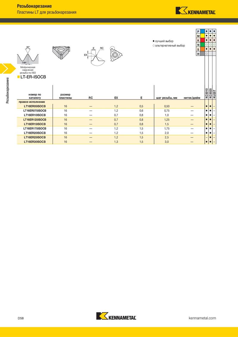 Резьбонарезание Пластины LT для резьбонарезания P ⅷ ⅷ ⅷ M ⅷ ⅷ ⅷ ⅷ лучший выбор K ⅷ ⅷ ⅷ ࠗ альтернативный выбор N ࠗ ࠗ ࠗ S ⅷ ⅷ ⅷ H ࠗ Метрическая наружная резьба по ISO Резьбонарезание LT-ER-ISOCB номер по размер KC5010 KC5025 KU25T каталогу пластины RC EX E шаг резьбы, мм ниток/дюйм правое исполнение LT16ER05ISOCB 16 — 1,2 0,5 0,50 — ⅷ ⅷ – LT16ER075ISOCB 16 — 1,2 0,6 0,75 — ⅷ ⅷ – LT16ER10ISOCB 16 — 0,7 0,8 1,0 — ⅷ ⅷ – LT16ER125ISOCB 16 — 0,7 0,8 1,25 — ⅷ ⅷ – LT16ER15ISOCB 16 — 0,7 0,8 1,5 — ⅷ ⅷ – LT16ER175ISOCB 16 — 1,2 1,5 1,75 — ⅷ ⅷ – LT16ER20ISOCB 16 — 1,2 1,5 2,0 — ⅷ ⅷ – LT16ER25ISOCB 16 — 1,2 1,5 2,5 — – ⅷ – LT16ER30ISOCB 16 — 1,3 1,5 3,0 — ⅷ ⅷ – D58 kennametal.com