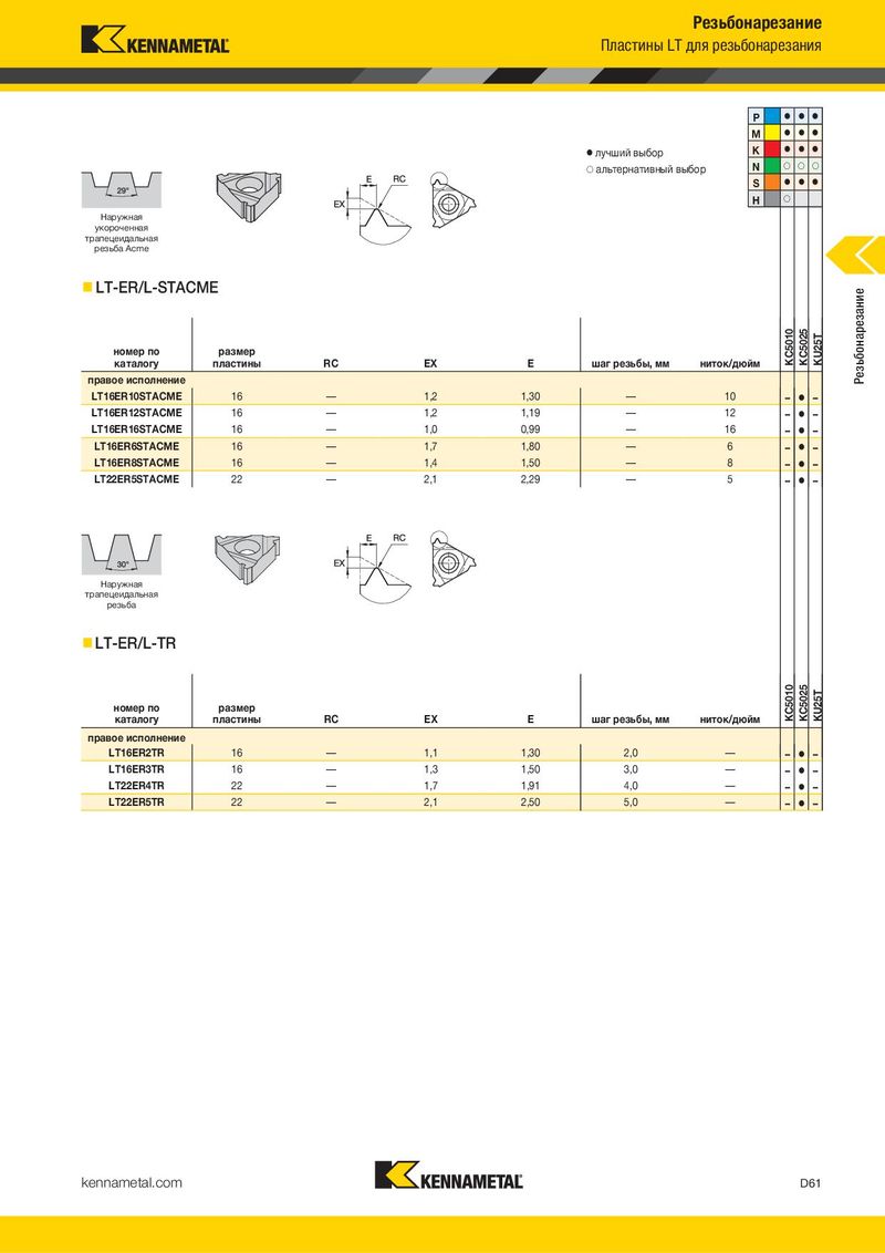 Резьбонарезание Пластины LT для резьбонарезания P ⅷ ⅷ ⅷ M ⅷ ⅷ ⅷ ⅷ лучший выбор K ⅷ ⅷ ⅷ ࠗ альтернативный выбор N ࠗ ࠗ ࠗ S ⅷ ⅷ ⅷ H ࠗ Наружная укороченная трапецеидальная резьба Acme LT-ER/L-STACME Резьбонарезание номер по размер KC5010 KC5025 KU25T каталогу пластины RC EX E шаг резьбы, мм ниток/дюйм правое исполнение LT16ER10STACME 16 — 1,2 1,30 — 10 – ⅷ – LT16ER12STACME 16 — 1,2 1,19 — 12 – ⅷ – LT16ER16STACME 16 — 1,0 0,99 — 16 – ⅷ – LT16ER6STACME 16 — 1,7 1,80 — 6 – ⅷ – LT16ER8STACME 16 — 1,4 1,50 — 8 – ⅷ – LT22ER5STACME 22 — 2,1 2,29 — 5 – ⅷ – Наружная трапецеидальная резьба LT-ER/L-TR номер по размер KC5010 KC5025 KU25T каталогу пластины RC EX E шаг резьбы, мм ниток/дюйм правое исполнение LT16ER2TR 16 — 1,1 1,30 2,0 — – ⅷ – LT16ER3TR 16 — 1,3 1,50 3,0 — – ⅷ – LT22ER4TR 22 — 1,7 1,91 4,0 — – ⅷ – LT22ER5TR 22 — 2,1 2,50 5,0 — – ⅷ – kennametal.com D61