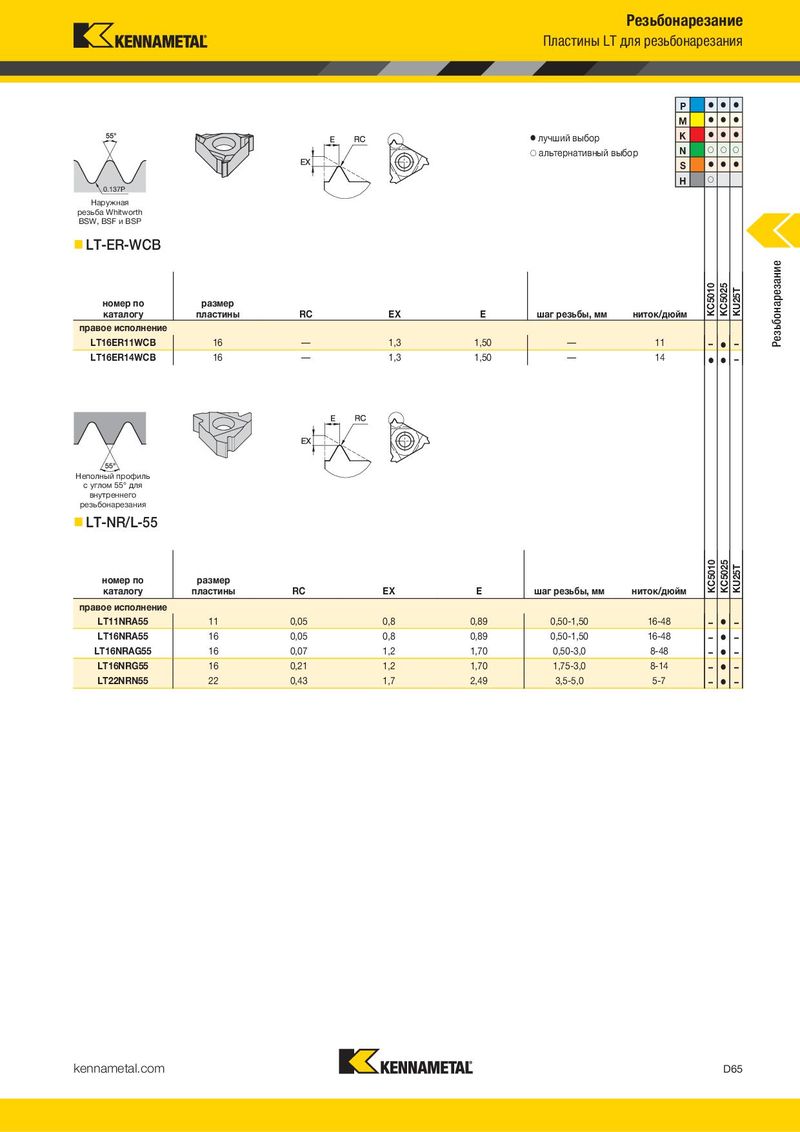 Резьбонарезание Пластины LT для резьбонарезания P ⅷ ⅷ ⅷ M ⅷ ⅷ ⅷ ⅷ лучший выбор K ⅷ ⅷ ⅷ ࠗ альтернативный выбор N ࠗ ࠗ ࠗ S ⅷ ⅷ ⅷ H ࠗ 0.137P Наружная резьба Whitworth BSW, BSF и BSP LT-ER-WCB номер по размер KC5010 KC5025 KU25T Резьбонарезание каталогу пластины RC EX E шаг резьбы, мм ниток/дюйм правое исполнение LT16ER11WCB 16 — 1,3 1,50 — 11 – ⅷ – LT16ER14WCB 16 — 1,3 1,50 — 14 ⅷ ⅷ – Неполный профиль с углом 55° для внутреннего резьбонарезания LT-NR/L-55 номер по размер KC5010 KC5025 KU25T каталогу пластины RC EX E шаг резьбы, мм ниток/дюйм правое исполнение LT11NRA55 11 0,05 0,8 0,89 0,50-1,50 16-48 – ⅷ – LT16NRA55 16 0,05 0,8 0,89 0,50-1,50 16-48 – ⅷ – LT16NRAG55 16 0,07 1,2 1,70 0,50-3,0 8-48 – ⅷ – LT16NRG55 16 0,21 1,2 1,70 1,75-3,0 8-14 – ⅷ – LT22NRN55 22 0,43 1,7 2,49 3,5-5,0 5-7 – ⅷ – kennametal.com D65