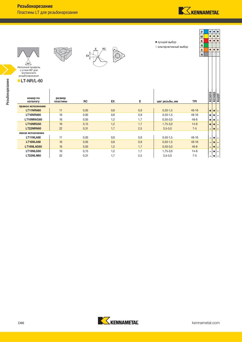 Резьбонарезание Пластины LT для резьбонарезания P ⅷ ⅷ ⅷ M ⅷ ⅷ ⅷ ⅷ лучший выбор K ⅷ ⅷ ⅷ ࠗ альтернативный выбор N ࠗ ࠗ ࠗ S ⅷ ⅷ ⅷ H ࠗ Неполный профиль с углом 60° для внутреннего резьбонарезания Резьбонарезание LT-NR/L-60 номер по размер KC5010 KC5025 KU25T каталогу пластины RC EX E шаг резьбы, мм TPI правое исполнение LT11NRA60 11 0,05 0,8 0,9 0,50-1,5 48-16 ⅷ ⅷ – LT16NRA60 16 0,05 0,8 0,9 0,50-1,5 48-16 ⅷ ⅷ – LT16NRAG60 16 0,05 1,2 1,7 0,50-3,0 48-8 ⅷ ⅷ – LT16NRG60 16 0,15 1,2 1,7 1,75-3,0 14-8 ⅷ ⅷ – LT22NRN60 22 0,31 1,7 2,5 3,5-5,0 7-5 – ⅷ – левое исполнение LT11NLA60 11 0,05 0,8 0,9 0,50-1,5 48-16 – ⅷ – LT16NLA60 16 0,05 0,8 0,9 0,50-1,5 48-16 – ⅷ – LT16NLAG60 16 0,05 1,2 1,7 0,50-3,0 48-8 – ⅷ – LT16NLG60 16 0,15 1,2 1,7 1,75-3,0 14-8 – ⅷ – LT22NLN60 22 0,31 1,7 2,5 3,5-5,0 7-5 – ⅷ – D66 kennametal.com
