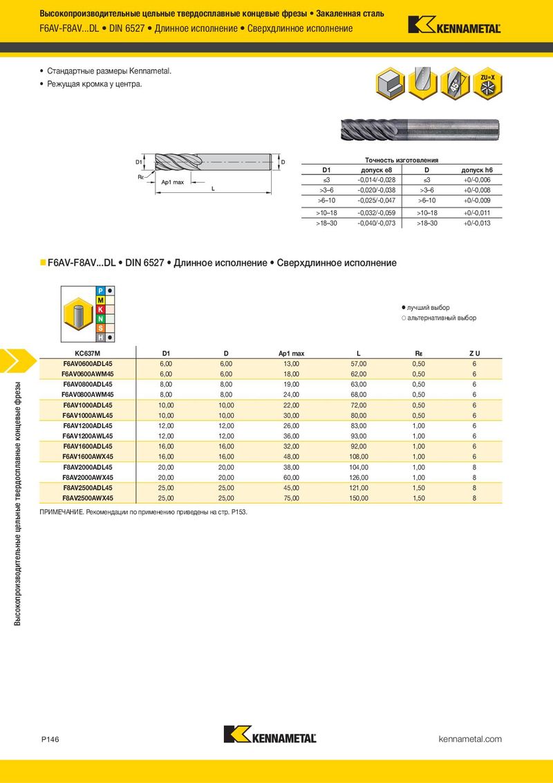 Высокопроизводительные цельные твердосплавные концевые фрезы • Закаленная сталь F6AV-F8AV...DL • DIN 6527 • Длинное исполнение • Сверхдлинное исполнение • Стандартные размеры Kennametal. • Режущая кромка у центра. Tочность изготовления D1 допуск e8 D допуск h6 )3 -0,014/-0,028 )3 +0/-0,006 >3–6 -0,020/-0,038 >3–6 +0/-0,008 >6–10 -0,025/-0,047 >6–10 +0/-0,009 >10–18 -0,032/-0,059 >10–18 +0/-0,011 >18–30 -0,040/-0,073 >18–30 +0/-0,013 F6AV-F8AV...DL • DIN 6527 • Длинное исполнение • Сверхдлинное исполнение ⅷ лучший выбор ࠗ альтернативный выбор KC637M D1 D Ap1 max L R¡ ZU F6AV0600ADL45 6,00 6,00 13,00 57,00 0,50 6 F6AV0600AWM45 6,00 6,00 18,00 62,00 0,50 6 Высокопроизводительные цельные твердосплавные концевые фрезы F6AV0800ADL45 8,00 8,00 19,00 63,00 0,50 6 F6AV0800AWM45 8,00 8,00 24,00 68,00 0,50 6 F6AV1000ADL45 10,00 10,00 22,00 72,00 0,50 6 F6AV1000AWL45 10,00 10,00 30,00 80,00 0,50 6 F6AV1200ADL45 12,00 12,00 26,00 83,00 1,00 6 F6AV1200AWL45 12,00 12,00 36,00 93,00 1,00 6 F6AV1600ADL45 16,00 16,00 32,00 92,00 1,00 6 F6AV1600AWX45 16,00 16,00 48,00 108,00 1,00 6 F8AV2000ADL45 20,00 20,00 38,00 104,00 1,00 8 F8AV2000AWX45 20,00 20,00 60,00 126,00 1,00 8 F8AV2500ADL45 25,00 25,00 45,00 121,00 1,50 8 F8AV2500AWX45 25,00 25,00 75,00 150,00 1,50 8 ПРИМЕЧАНИЕ. Рекомендации по применению приведены на стр. P153. P146 kennametal.com